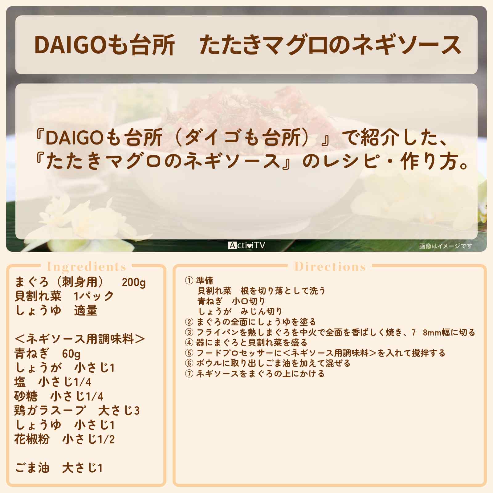 放送の【DAIGOも台所(ダイゴも台所)】で紹介した、『たたきマグロのネギソース』のレシピ・作り方。