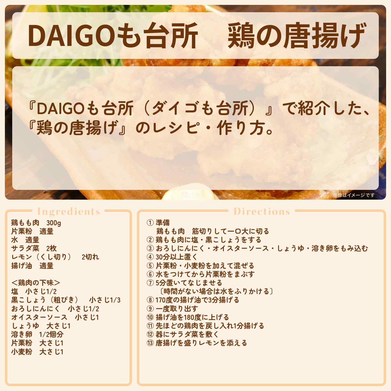 放送の【DAIGOも台所(ダイゴも台所)】で紹介した、『鶏の唐揚げ』のレシピ・作り方。