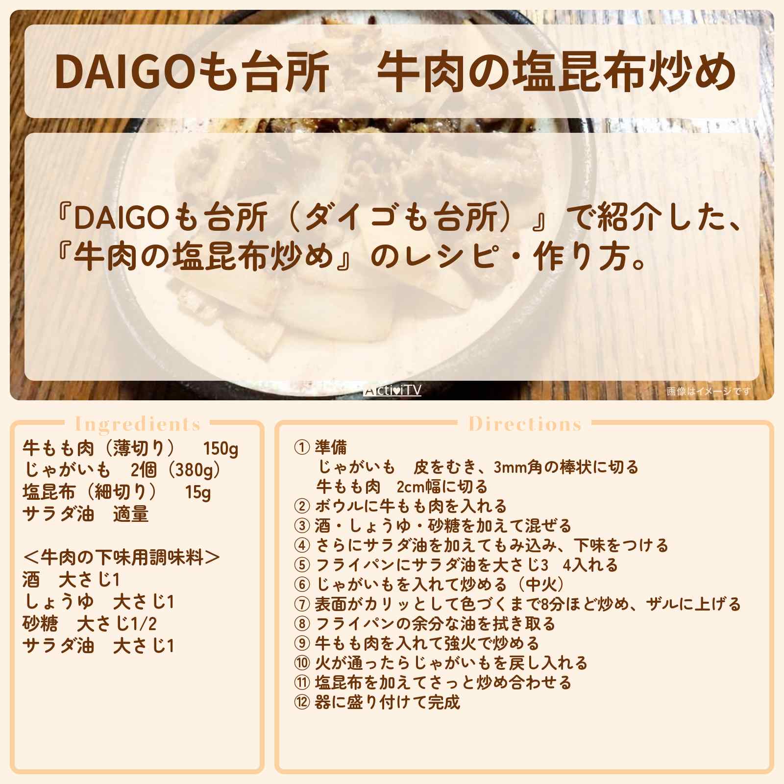 放送の【DAIGOも台所(ダイゴも台所)】で紹介した、『牛肉の塩昆布炒め』のレシピ・作り方。
