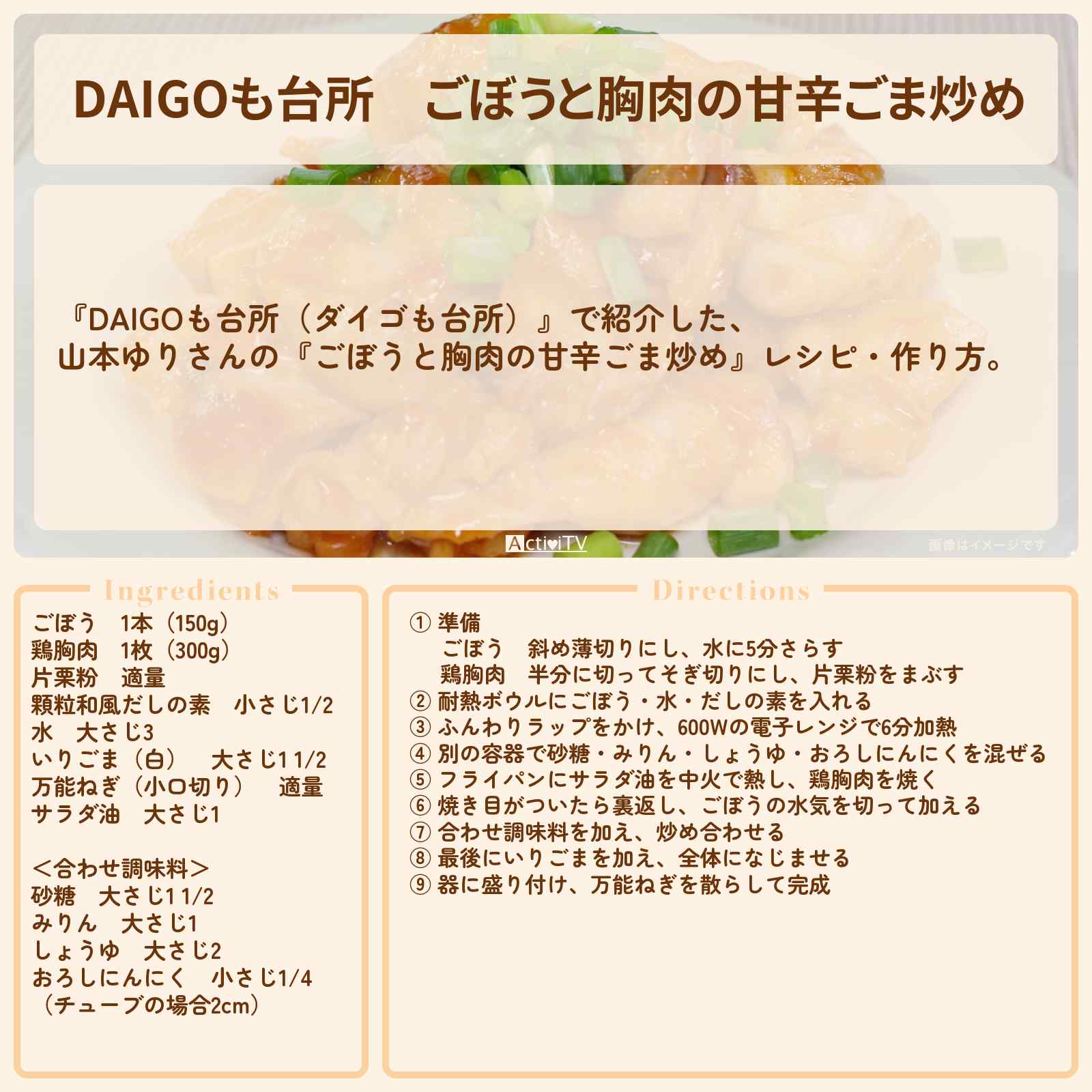 放送の【DAIGOも台所(ダイゴも台所)】で紹介した、山本ゆりさんの『ごぼうと胸肉の甘辛ごま炒め』レシピ・作り方。