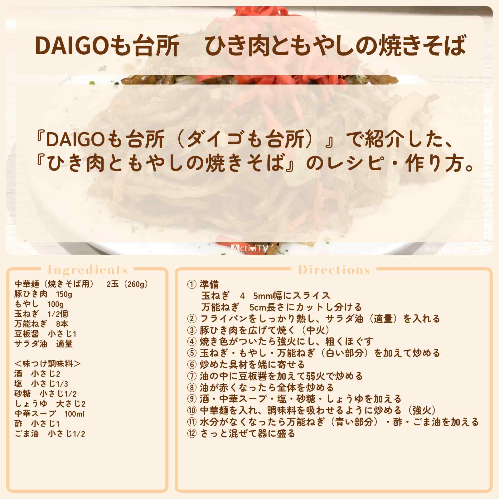放送の【DAIGOも台所(ダイゴも台所)】で紹介した、『ひき肉ともやしの焼きそば』のレシピ・作り方。