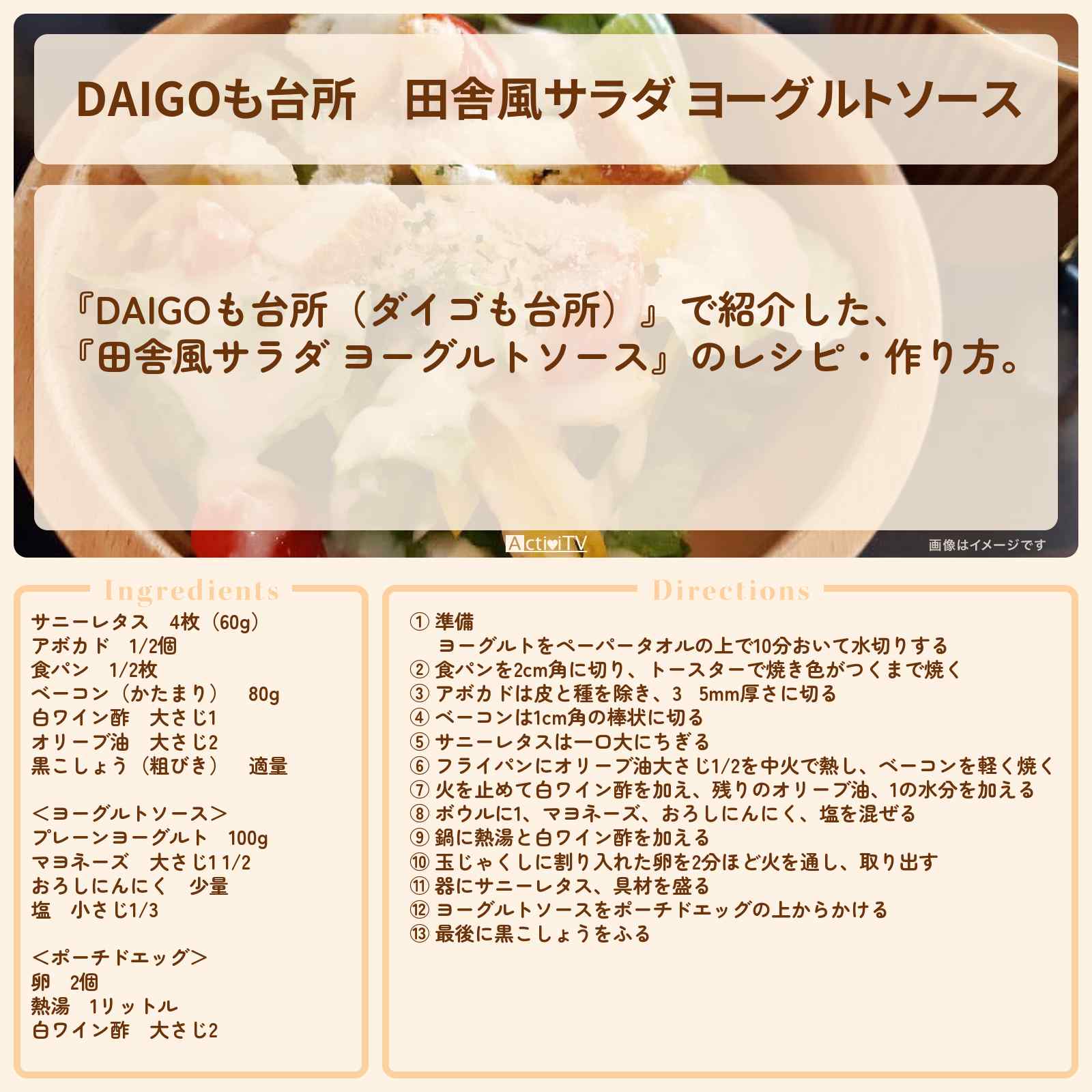 放送の【DAIGOも台所(ダイゴも台所)】で紹介した、『田舎風サラダ ヨーグルトソース』のレシピ・作り方。