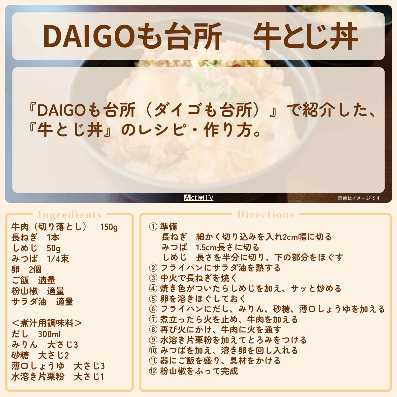 放送の【DAIGOも台所(ダイゴも台所)】で紹介した、『牛とじ丼』のレシピ・作り方。
