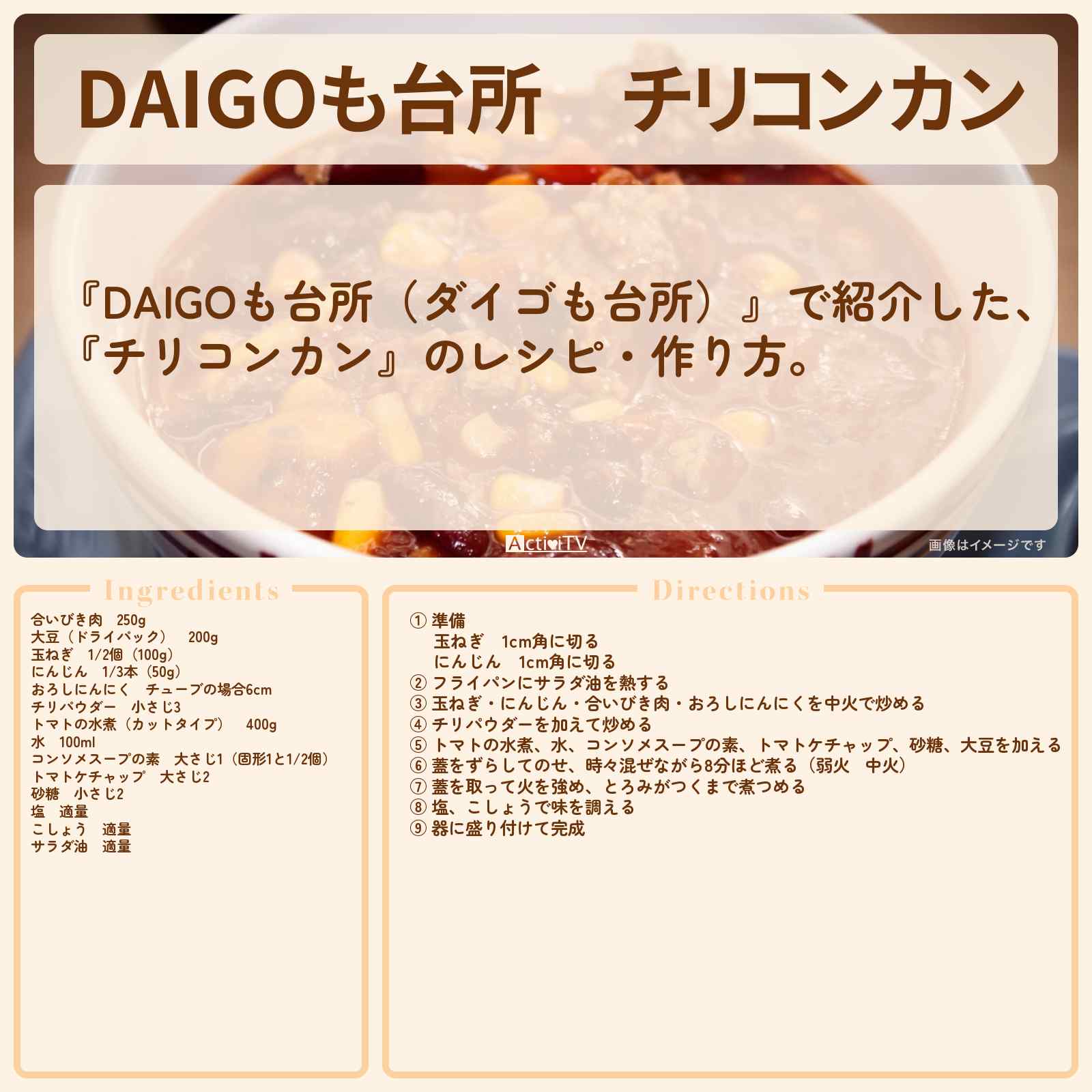 放送の【DAIGOも台所(ダイゴも台所)】で紹介した、『チリコンカン』のレシピ・作り方。