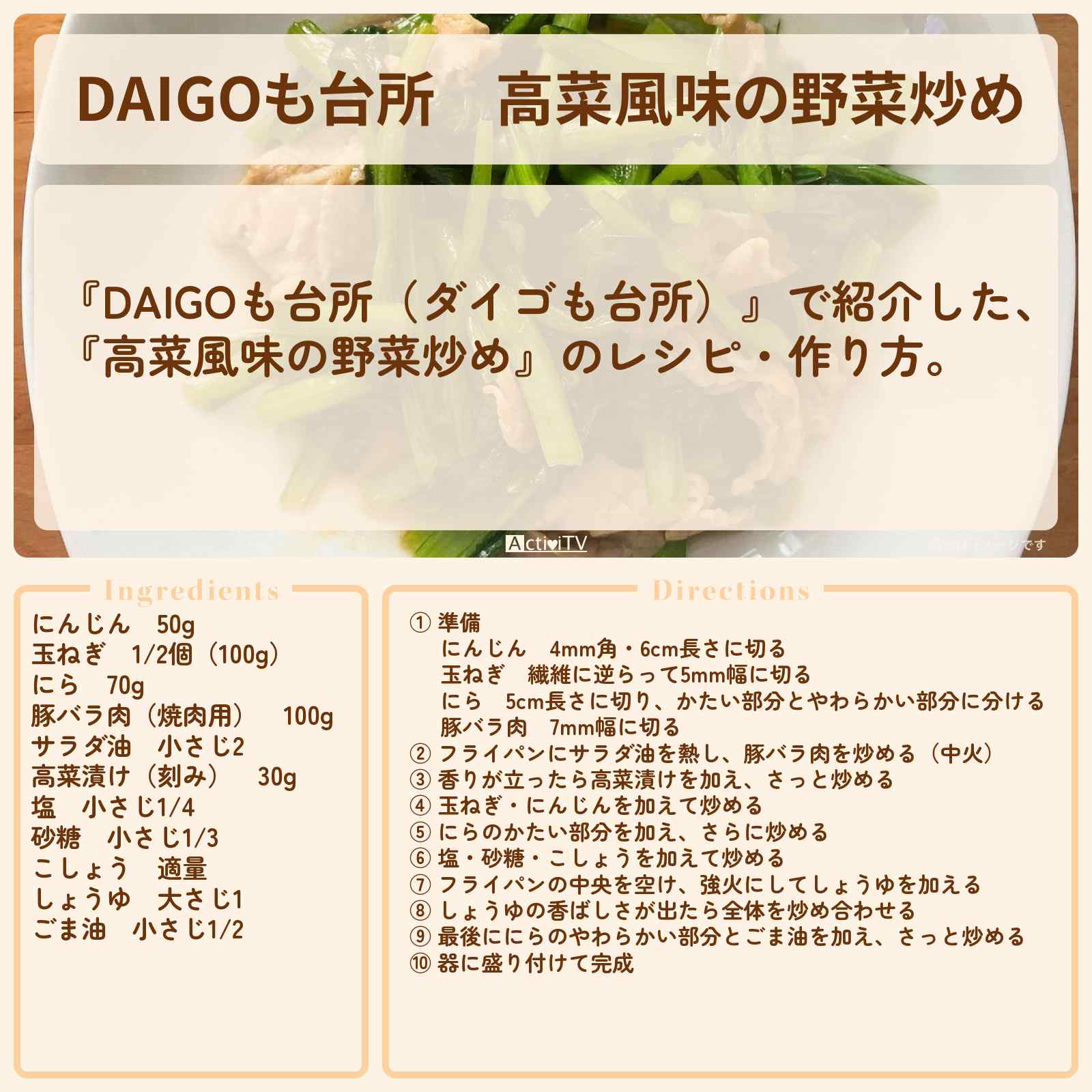 放送の【DAIGOも台所(ダイゴも台所)】で紹介した、『高菜風味の野菜炒め』のレシピ・作り方。