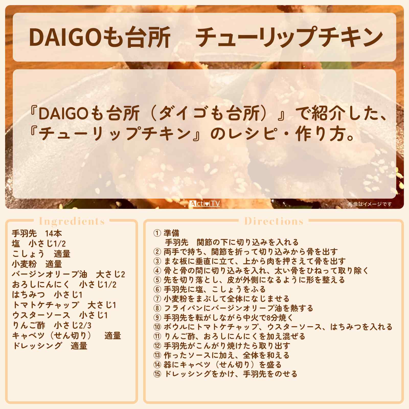 放送の【DAIGOも台所(ダイゴも台所)】で紹介した、『チューリップチキン』のレシピ・作り方。