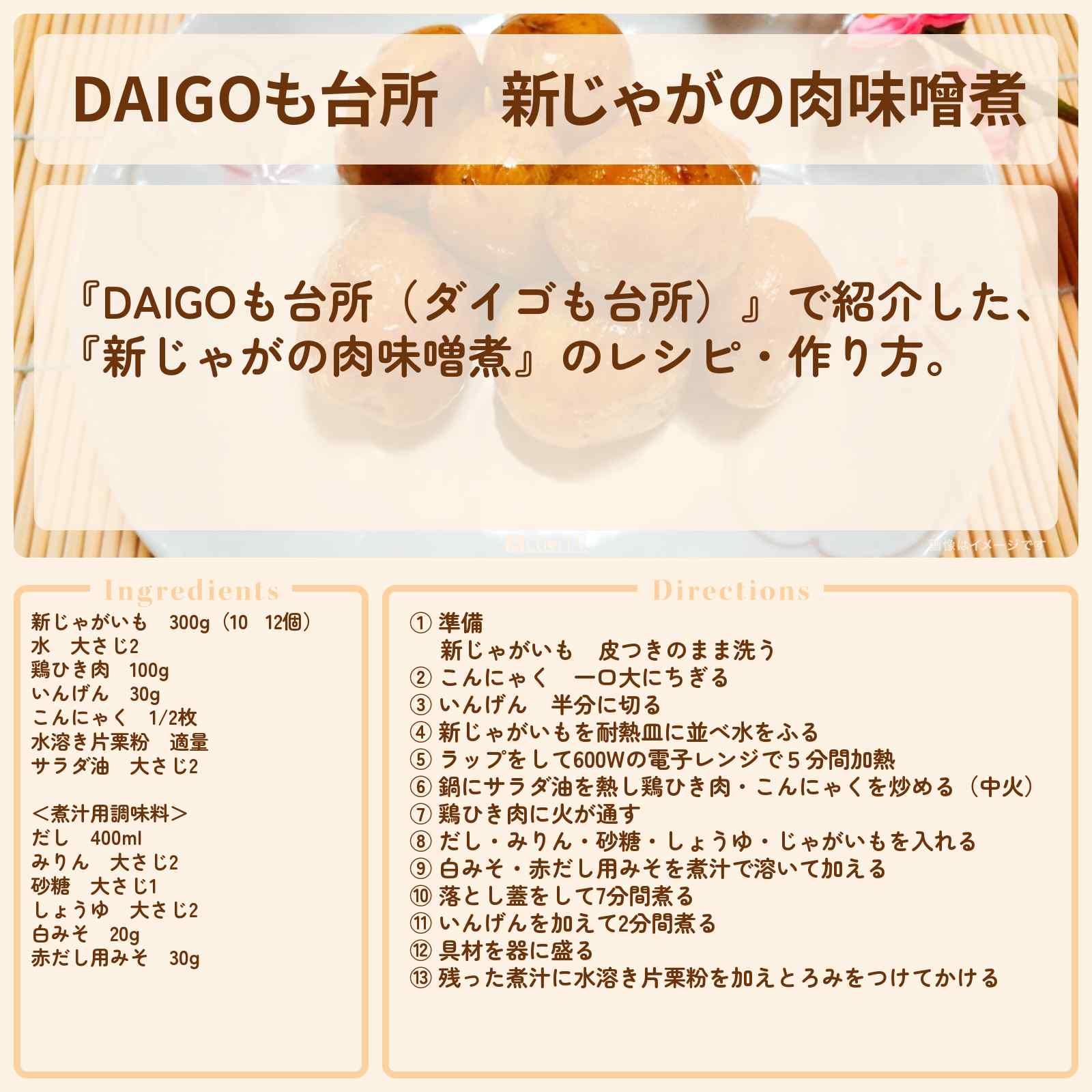 放送の【DAIGOも台所(ダイゴも台所)】で紹介した、『新じゃがの肉味噌煮』のレシピ・作り方。