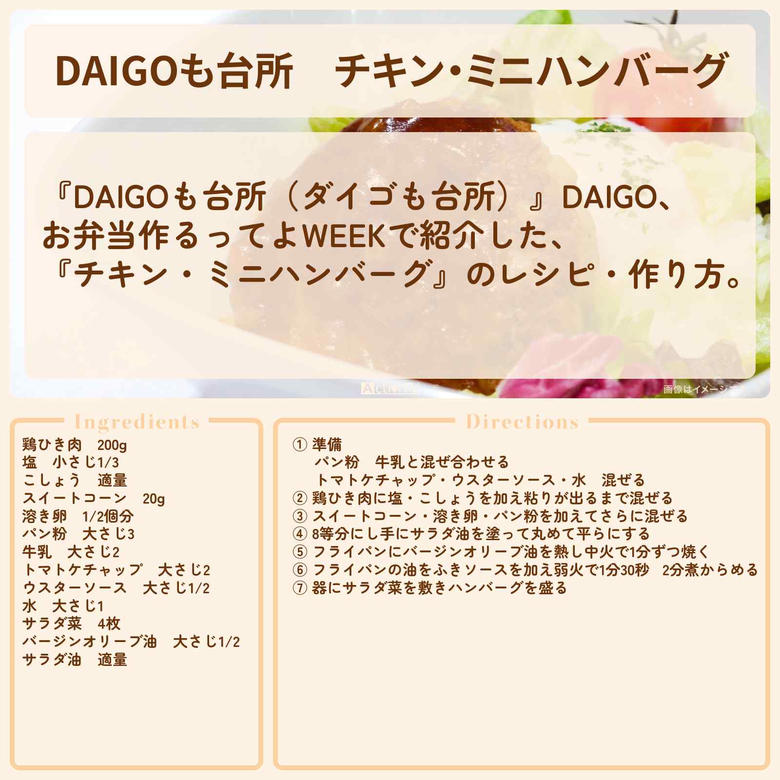 放送の【DAIGOも台所(ダイゴも台所)】DAIGO、お弁当作るってよWEEKで紹介した、『チキン・ミニハンバーグ』のレシピ・作り方。