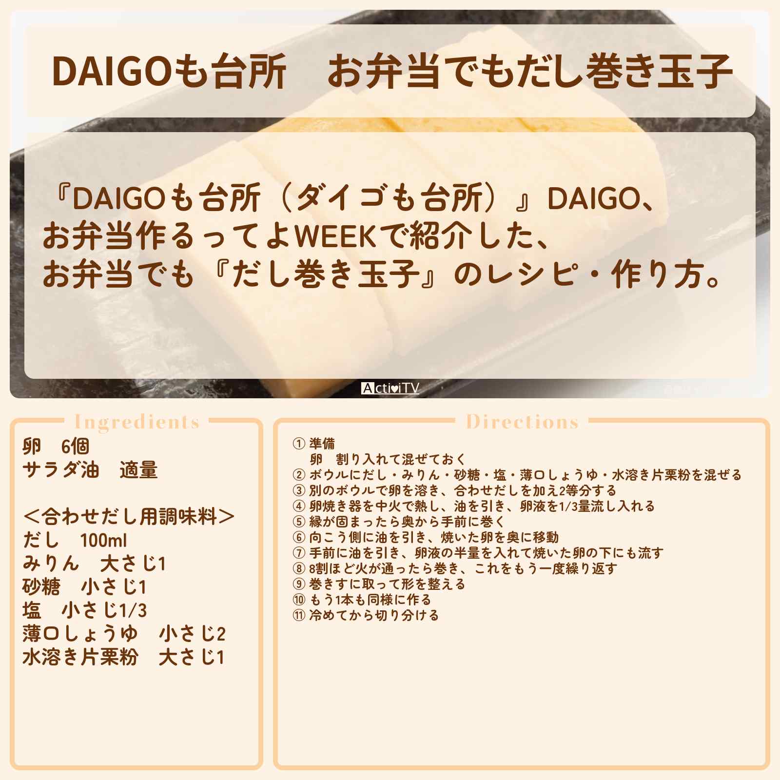 放送の【DAIGOも台所(ダイゴも台所)】DAIGO、お弁当作るってよWEEKで紹介した、お弁当でも『だし巻き玉子』のレシピ・作り方。