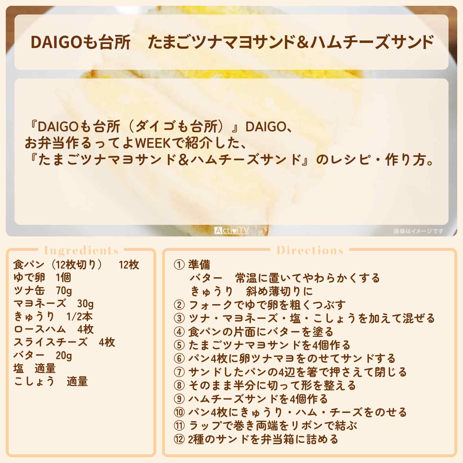 放送の【DAIGOも台所(ダイゴも台所)】DAIGO、お弁当作るってよWEEKで紹介した、『たまごツナマヨサンド&ハムチーズサンド』のレシピ・作り方。