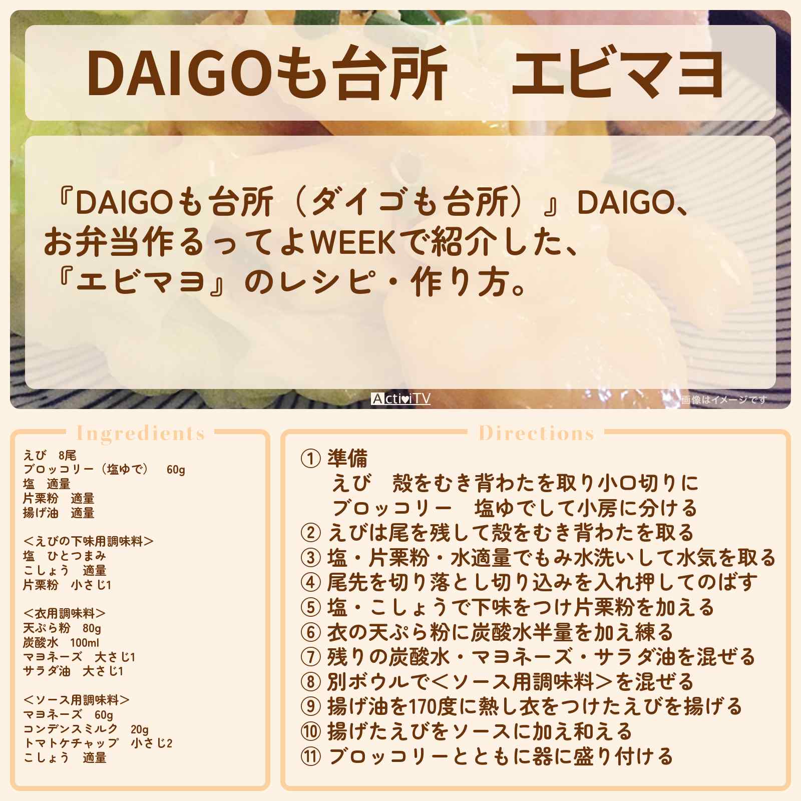 放送の【DAIGOも台所(ダイゴも台所)】DAIGO、お弁当作るってよWEEKで紹介した、『エビマヨ』のレシピ・作り方。