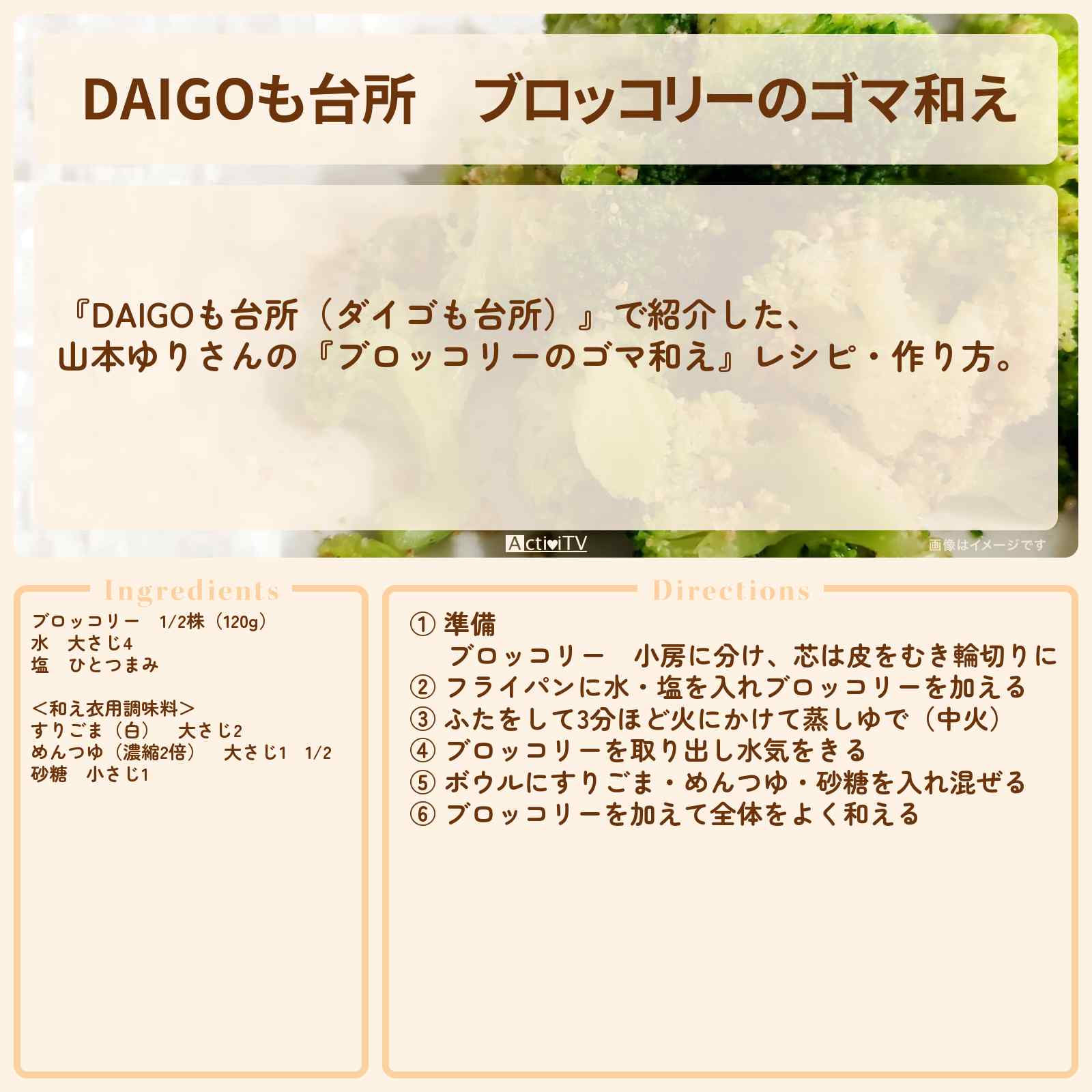 放送の【DAIGOも台所(ダイゴも台所)】で紹介した、山本ゆりさんの『ブロッコリーのゴマ和え』レシピ・作り方。