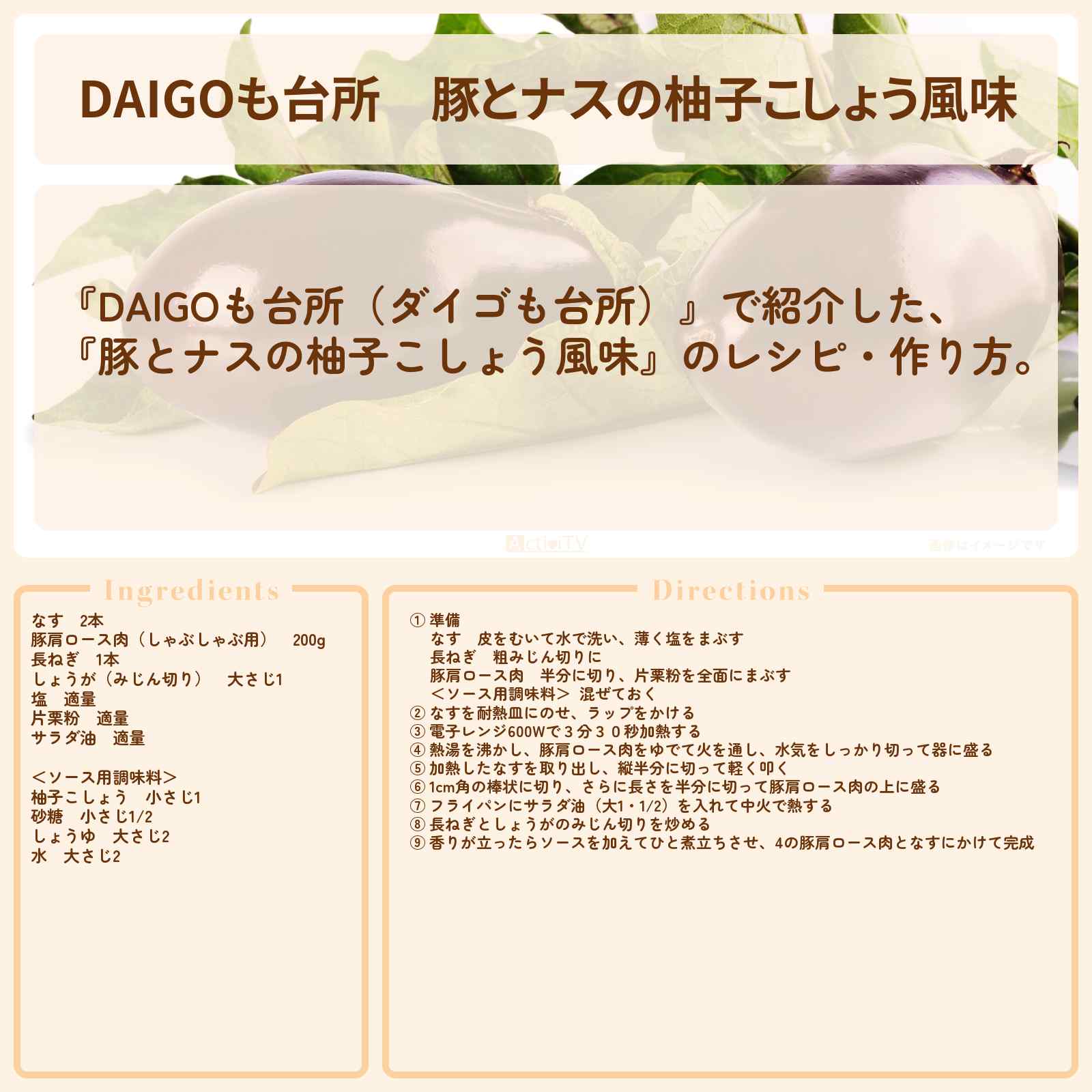 放送の【DAIGOも台所(ダイゴも台所)】で紹介した、『豚とナスの柚子こしょう風味』のレシピ・作り方。