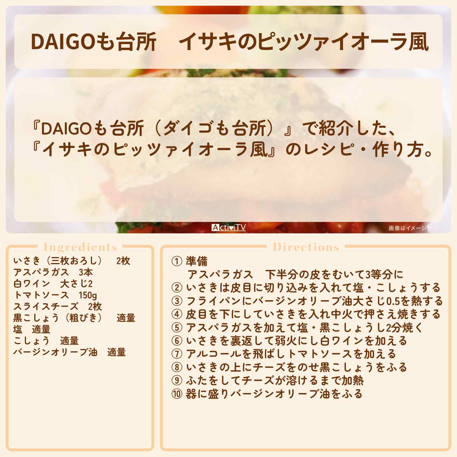 放送の【DAIGOも台所(ダイゴも台所)】で紹介した、『イサキのピッツァイオーラ風』のレシピ・作り方。
