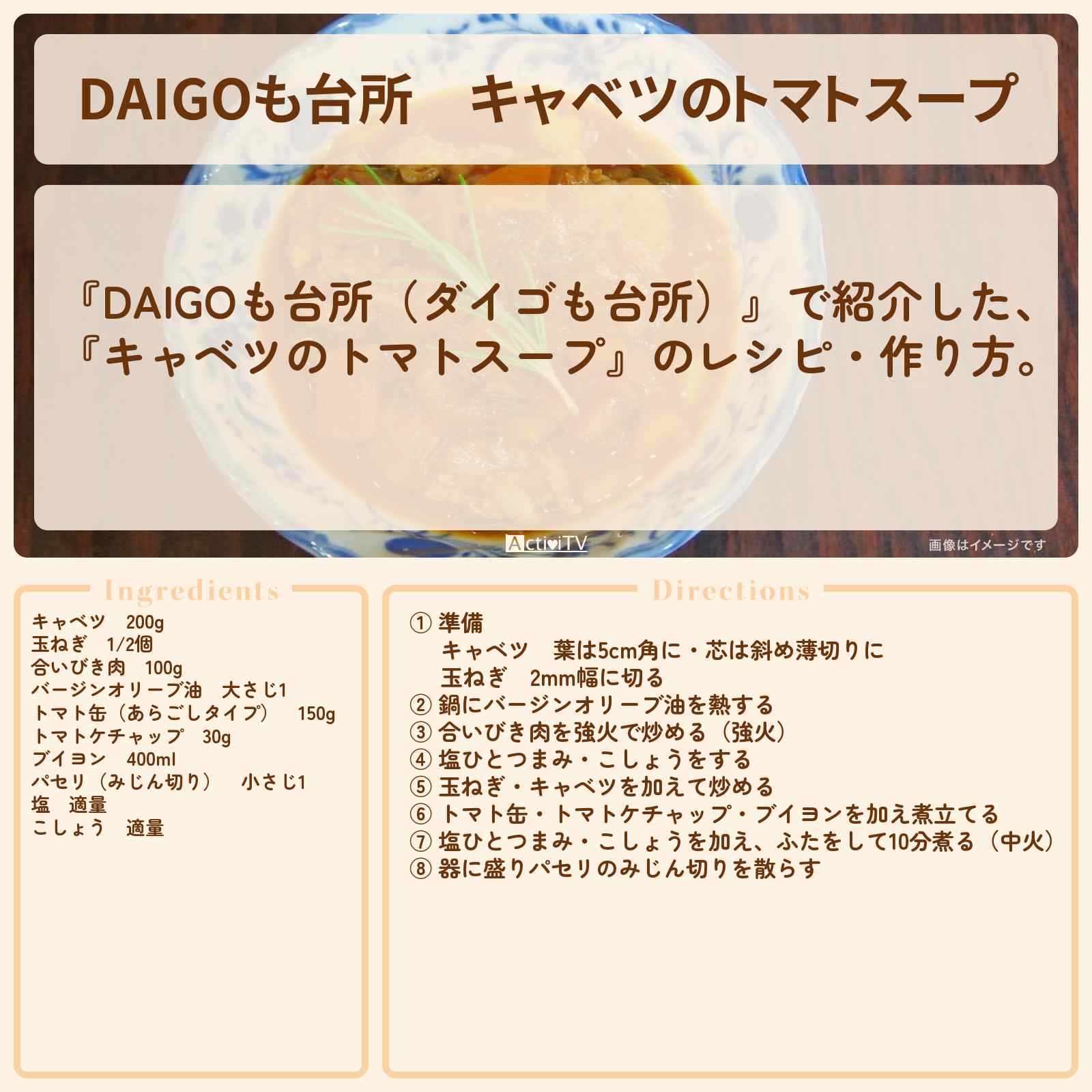 放送の【DAIGOも台所(ダイゴも台所)】で紹介した、『キャベツのトマトスープ』のレシピ・作り方。