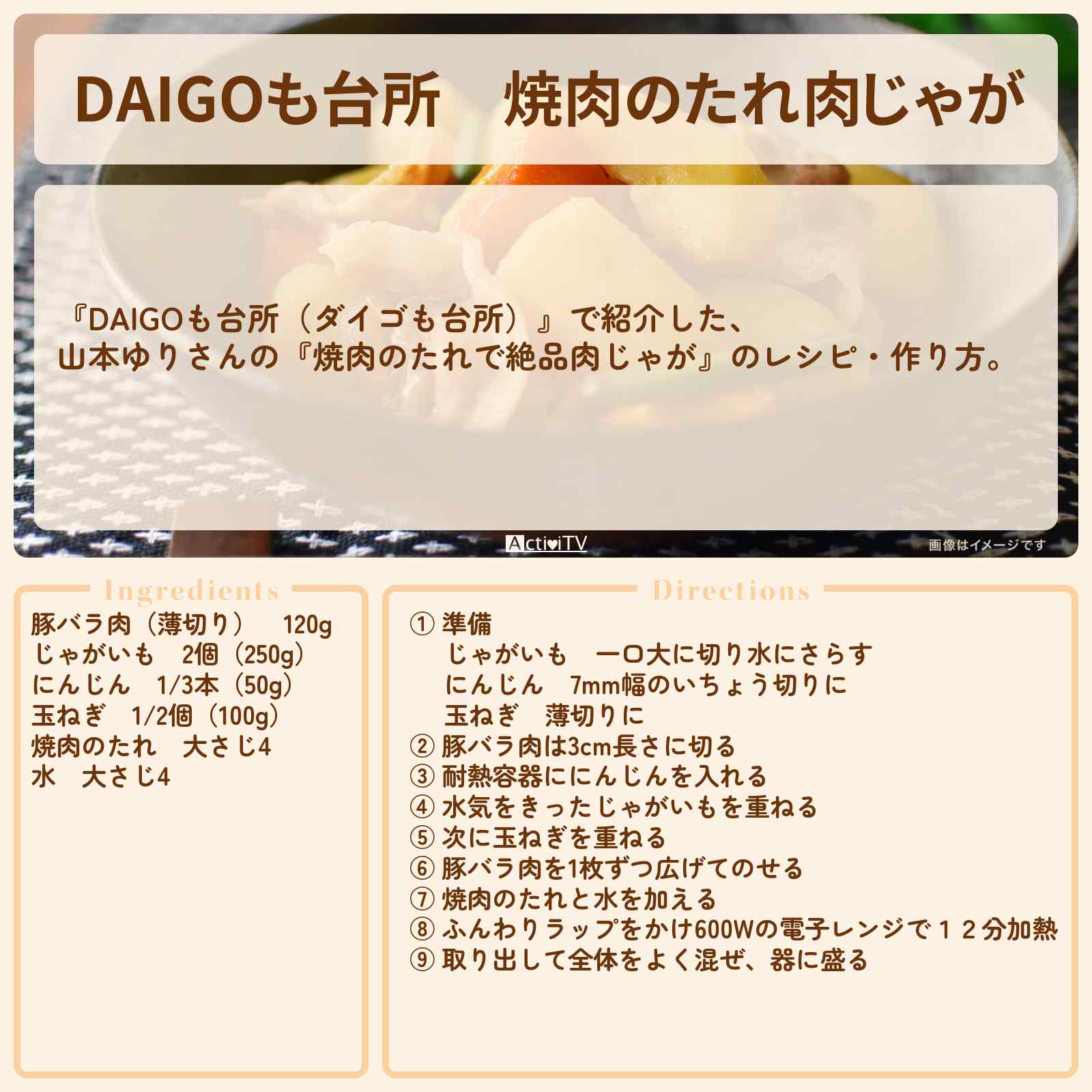 放送の【DAIGOも台所(ダイゴも台所)】で紹介した、山本ゆりさんの『焼肉のたれで絶品肉じゃが』のレシピ・作り方。