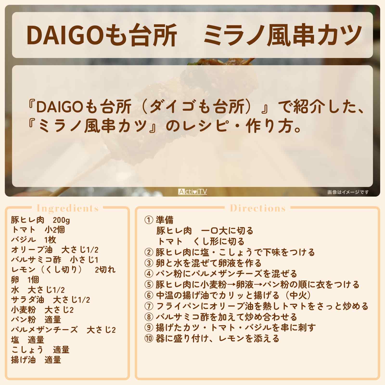 放送の【DAIGOも台所(ダイゴも台所)】で紹介した、『ミラノ風串カツ』のレシピ・作り方。