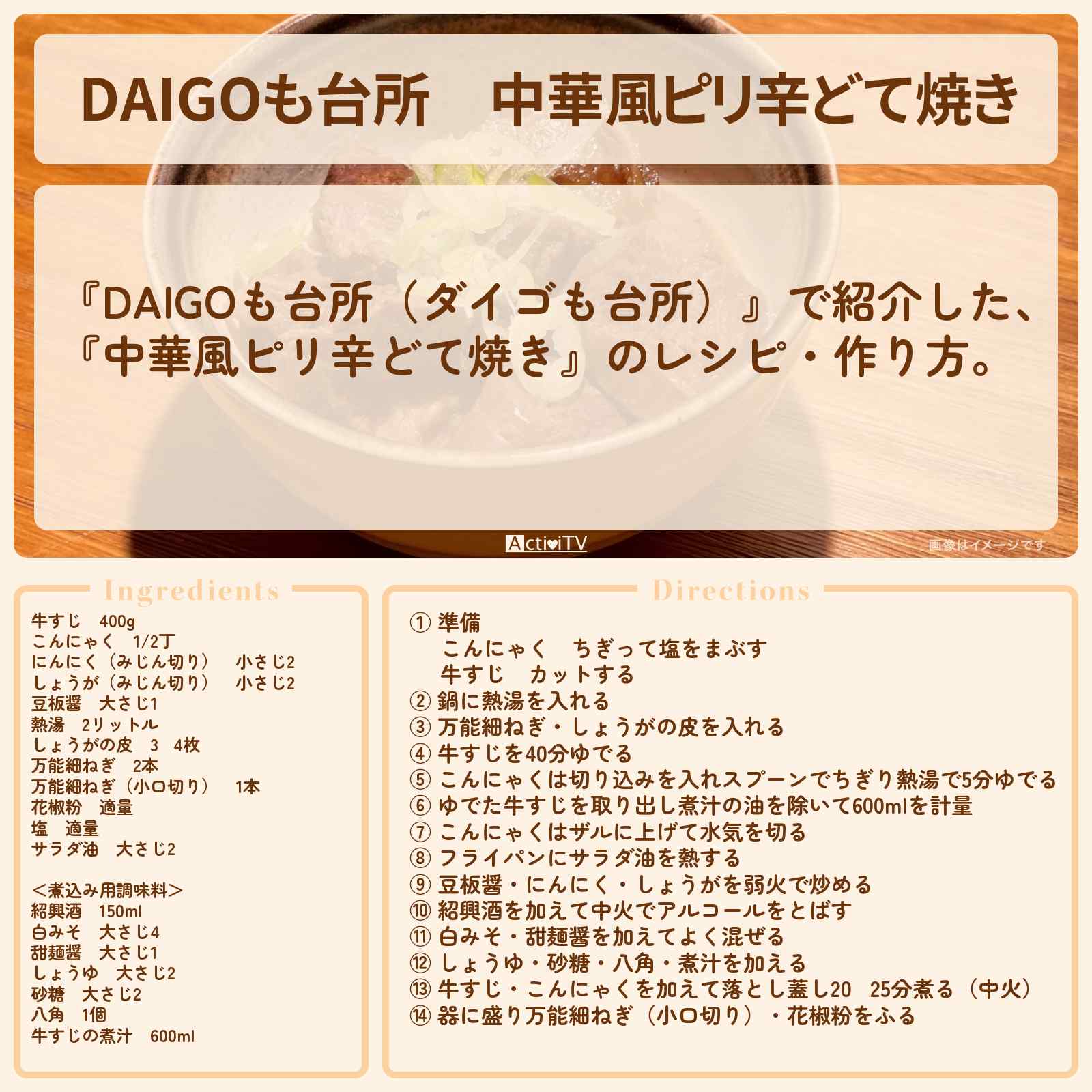 放送の【DAIGOも台所(ダイゴも台所)】で紹介した、『中華風ピリ辛どて焼き』のレシピ・作り方。