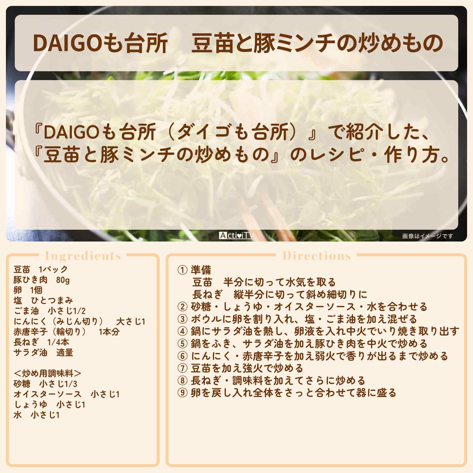 放送の【DAIGOも台所(ダイゴも台所)】で紹介した、『豆苗と豚ミンチの炒めもの』のレシピ・作り方。