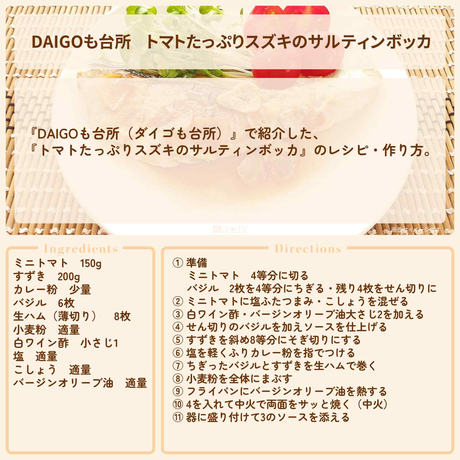 放送の【DAIGOも台所(ダイゴも台所)】で紹介した、『トマトたっぷりスズキのサルティンボッカ』のレシピ・作り方。