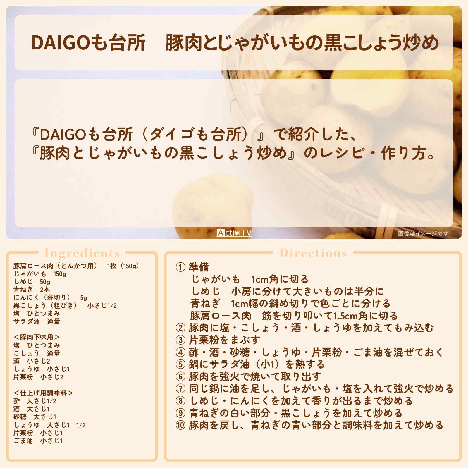 放送の【DAIGOも台所(ダイゴも台所)】で紹介した、『豚肉とじゃがいもの黒こしょう炒め』のレシピ・作り方。
