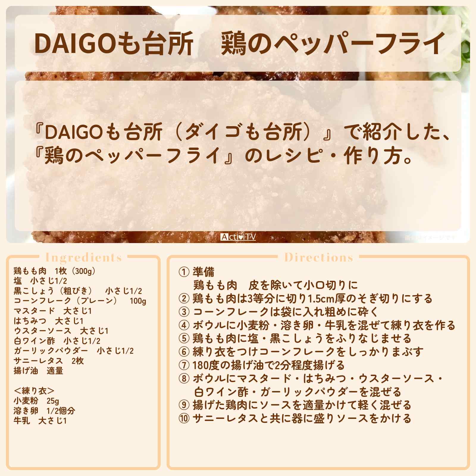 放送の【DAIGOも台所(ダイゴも台所)】で紹介した、『鶏のペッパーフライ』のレシピ・作り方。