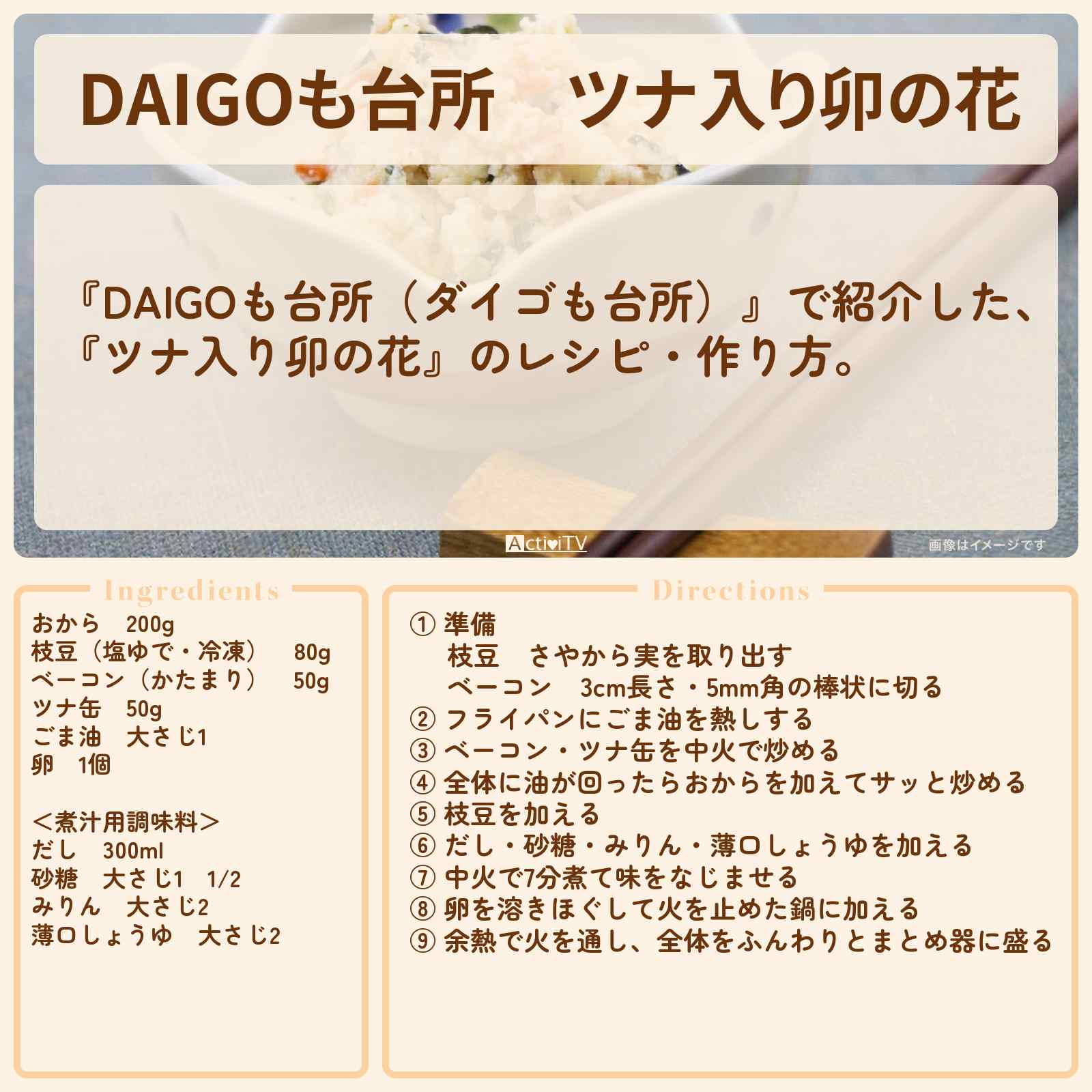 放送の【DAIGOも台所(ダイゴも台所)】で紹介した、『ツナ入り卯の花』のレシピ・作り方。