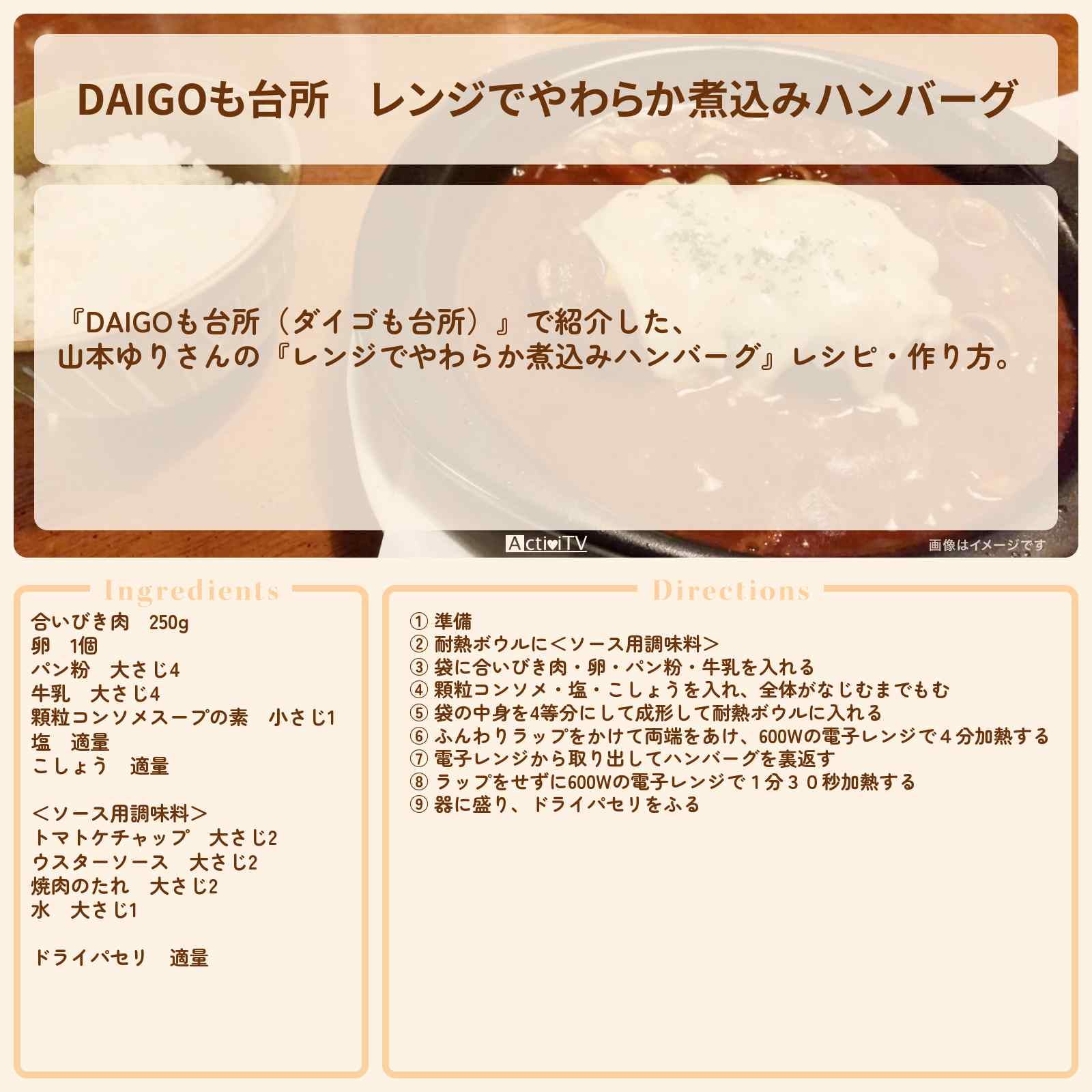 放送の【DAIGOも台所(ダイゴも台所)】で紹介した、山本ゆりさんの『レンジでやわらか煮込みハンバーグ』レシピ・作り方。