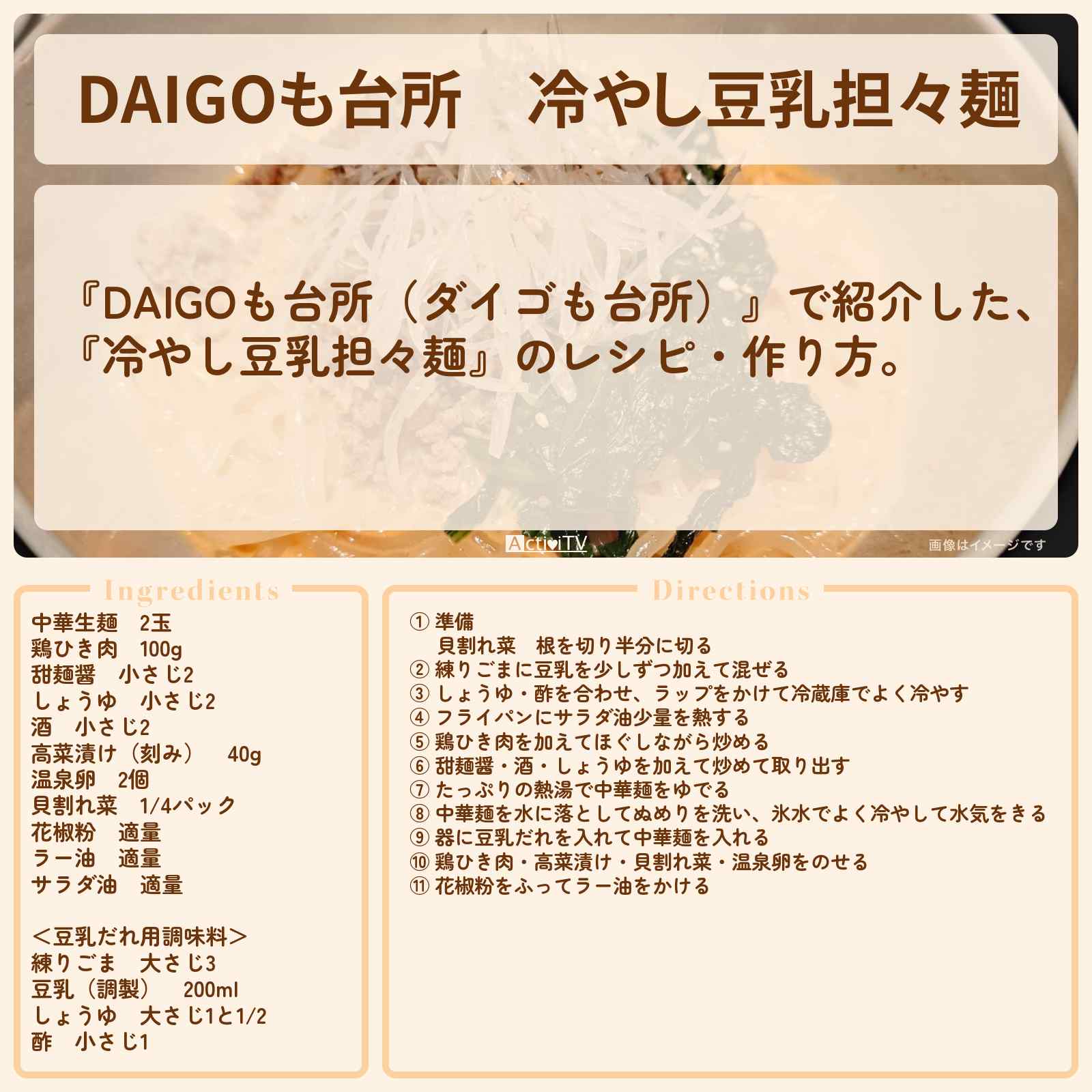 放送の【DAIGOも台所(ダイゴも台所)】で紹介した、『冷やし豆乳担々麺』のレシピ・作り方。