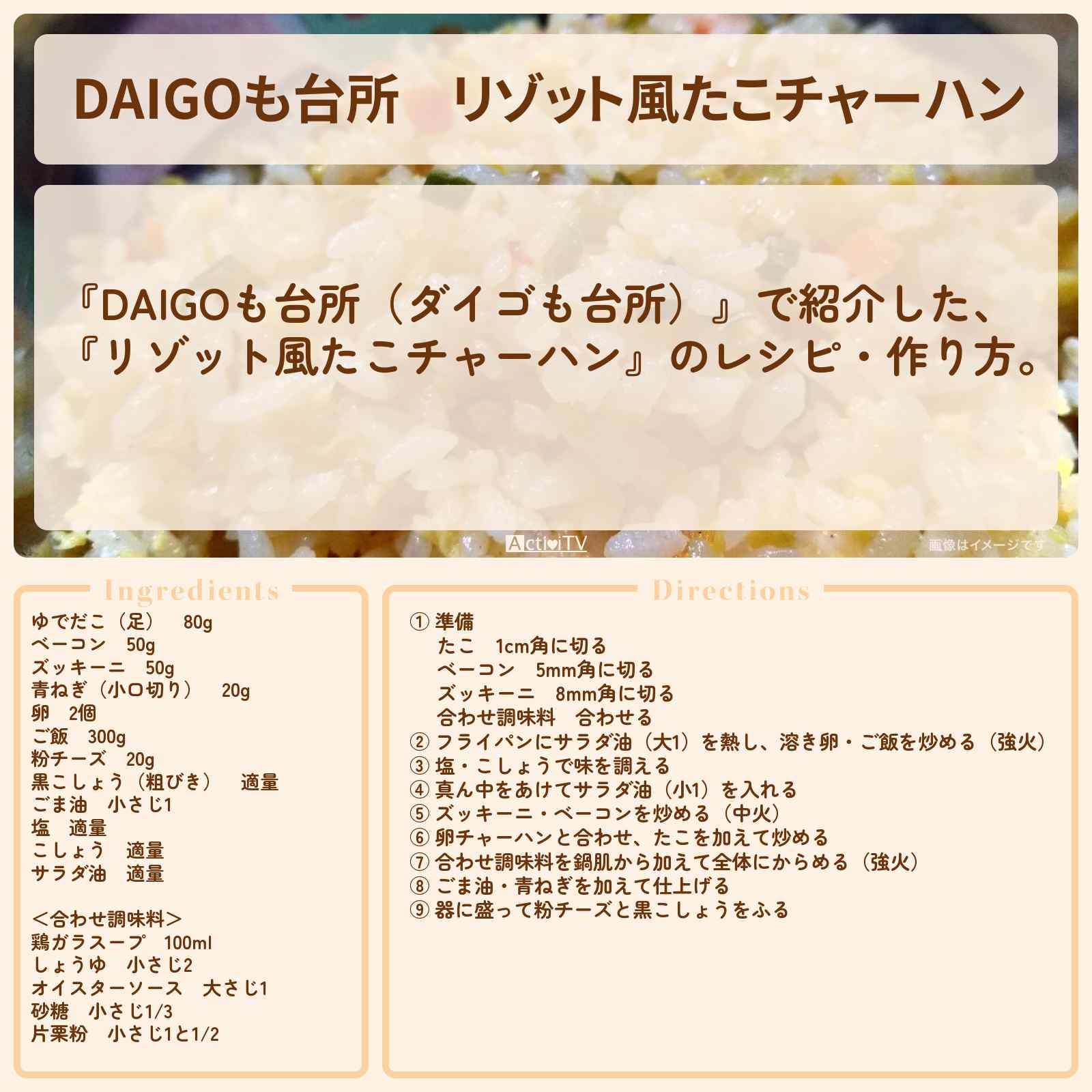 放送の【DAIGOも台所(ダイゴも台所)】で紹介した、『リゾット風たこチャーハン』のレシピ・作り方。