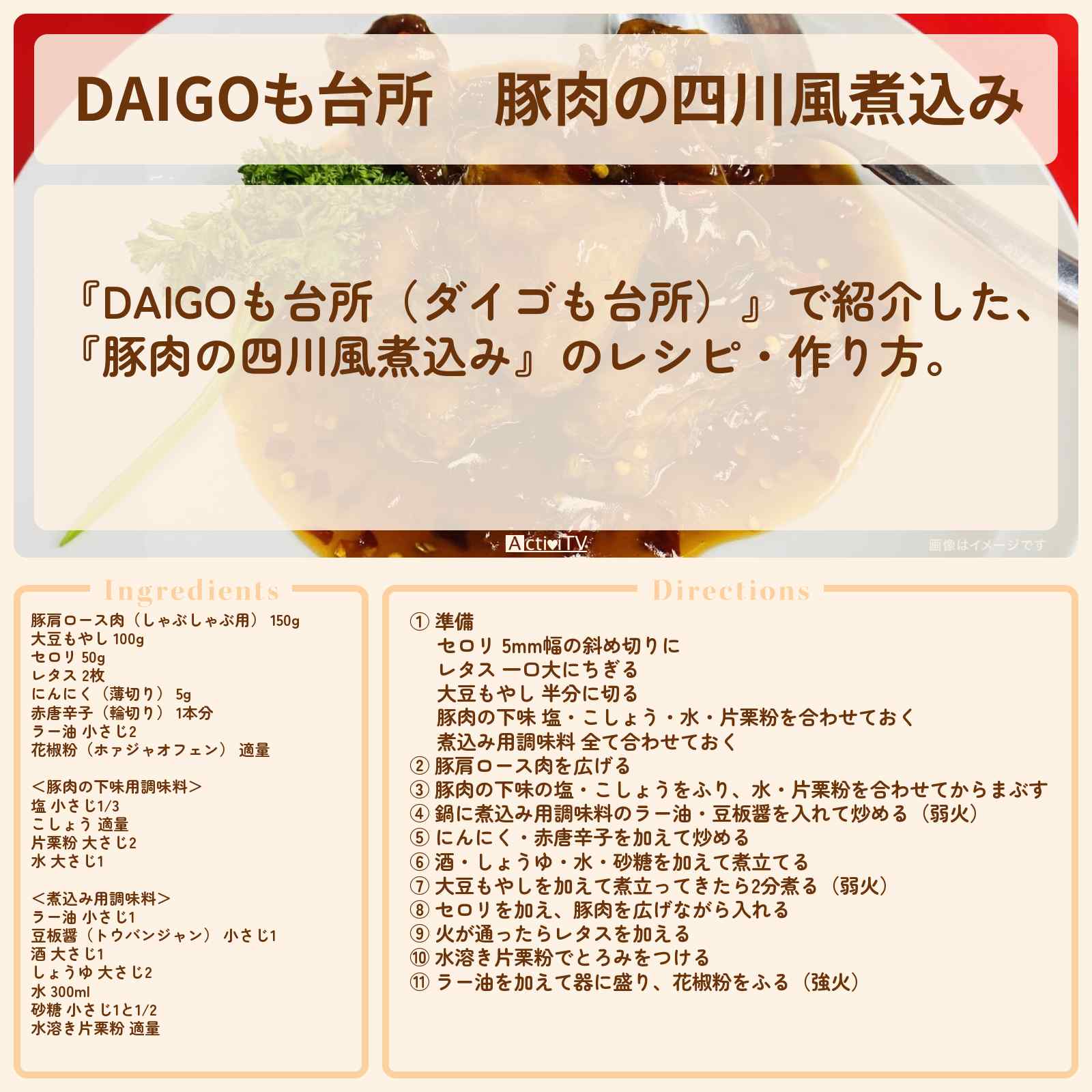 放送の【DAIGOも台所(ダイゴも台所)】で紹介した、『豚肉の四川風煮込み』のレシピ・作り方。