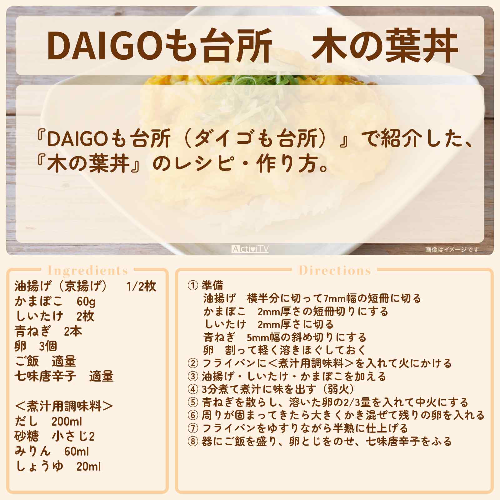 放送の【DAIGOも台所(ダイゴも台所)】で紹介した、『木の葉丼』のレシピ・作り方。