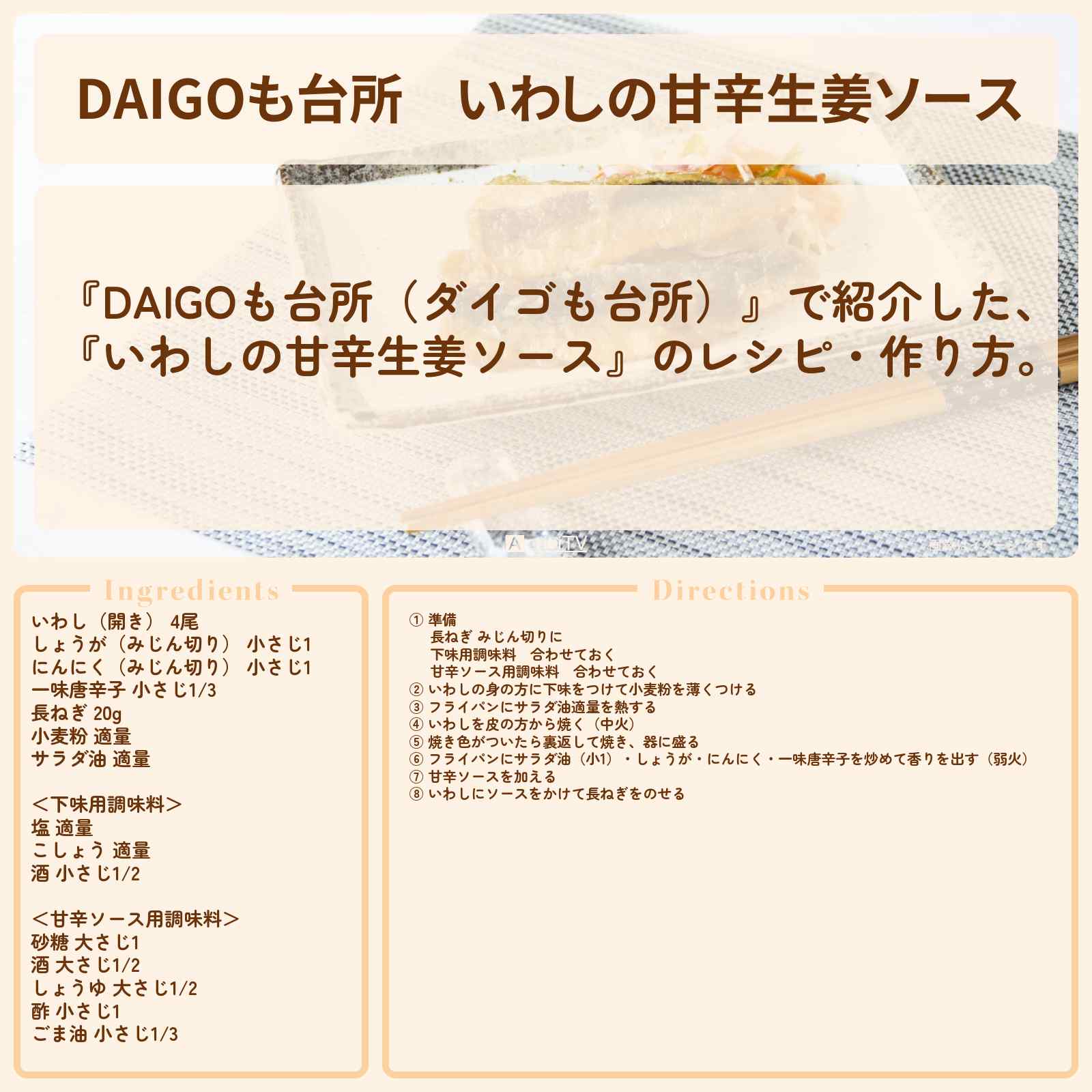 放送の【DAIGOも台所(ダイゴも台所)】で紹介した、『いわしの甘辛生姜ソース』のレシピ・作り方。