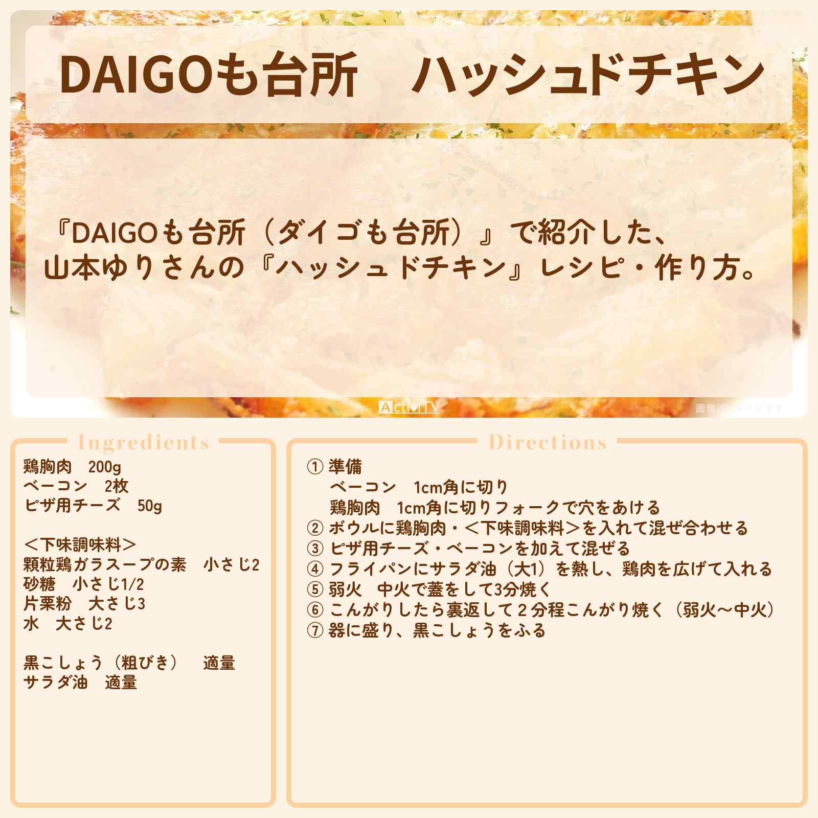 放送の【DAIGOも台所(ダイゴも台所)】で紹介した、山本ゆりさんの『ハッシュドチキン』レシピ・作り方。