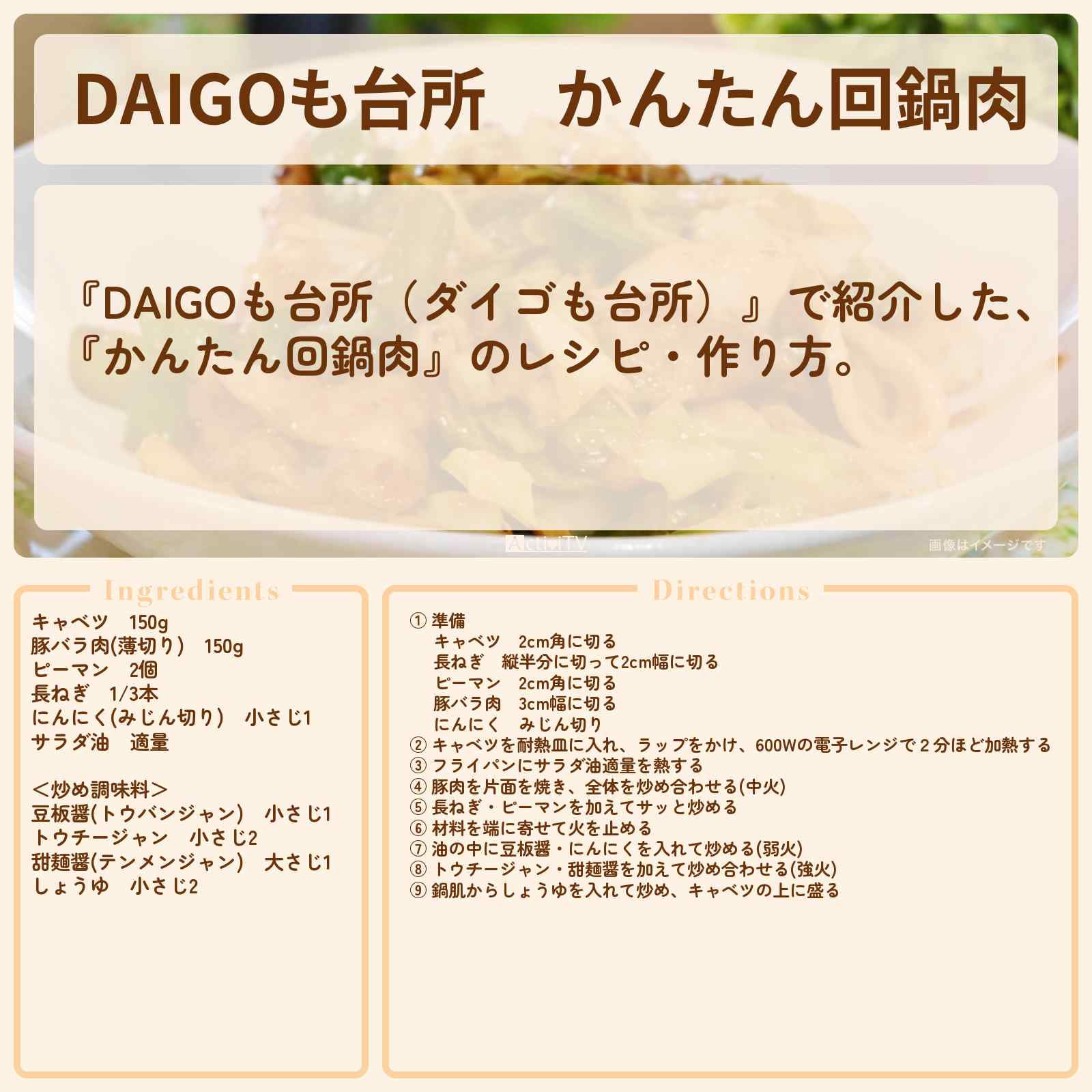 放送の【DAIGOも台所(ダイゴも台所)】で紹介した、『かんたん回鍋肉』のレシピ・作り方。