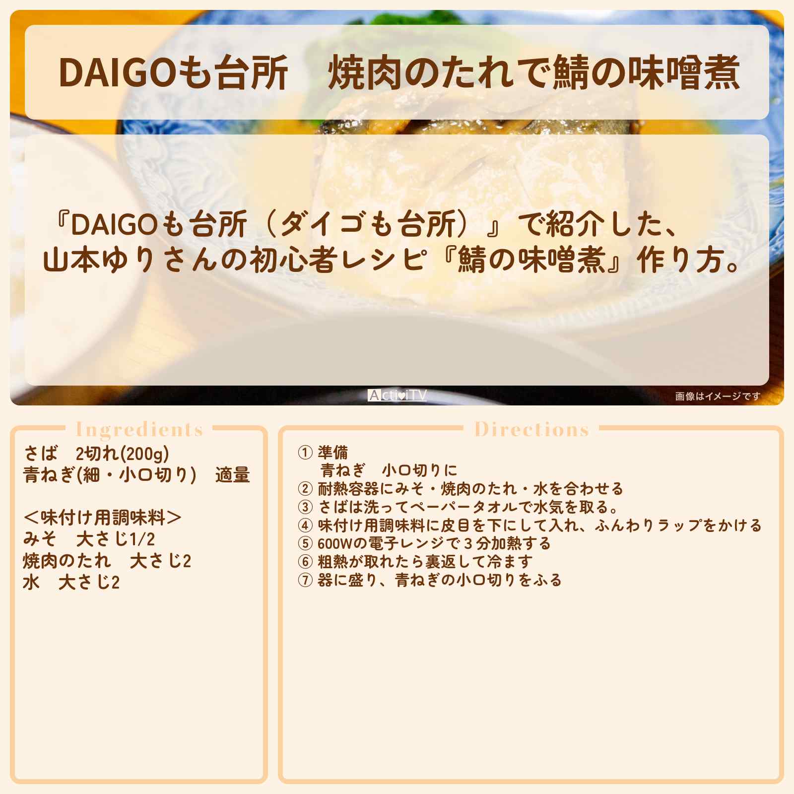 放送の【DAIGOも台所(ダイゴも台所)】で紹介した、山本ゆりさんの初心者レシピ『鯖の味噌煮』作り方。