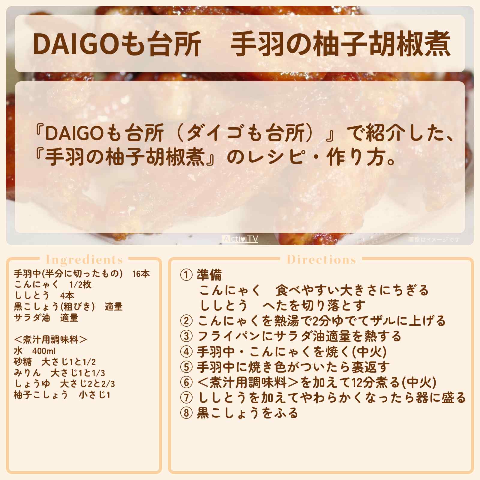 放送の【DAIGOも台所(ダイゴも台所)】で紹介した、『手羽の柚子胡椒煮』のレシピ・作り方。