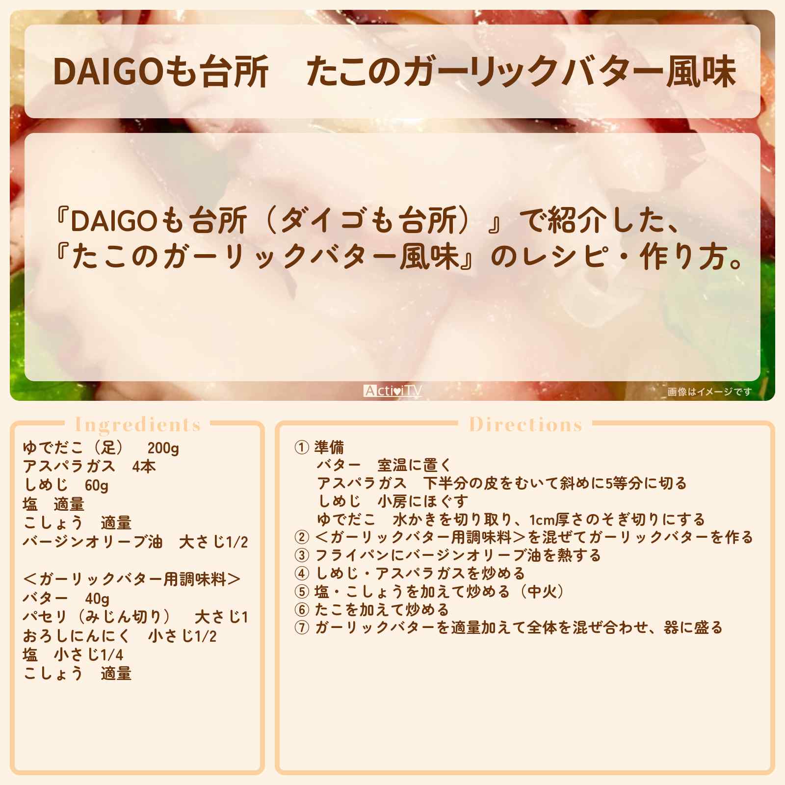 放送の【DAIGOも台所(ダイゴも台所)】で紹介した、『たこのガーリックバター風味』のレシピ・作り方。