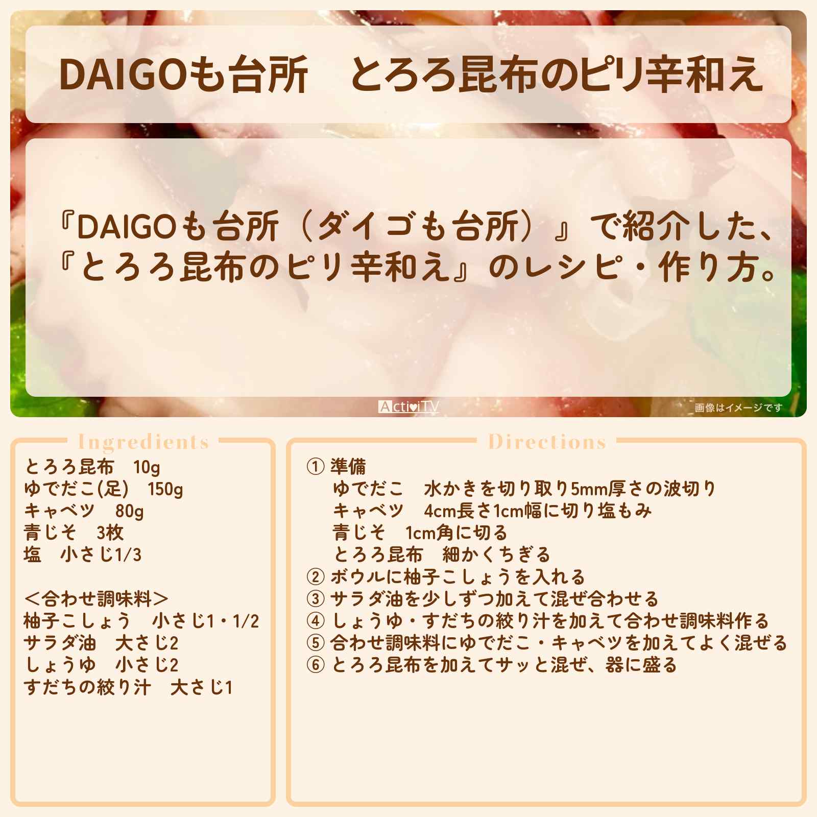 放送の【DAIGOも台所(ダイゴも台所)】で紹介した、『とろろ昆布のピリ辛和え』のレシピ・作り方。