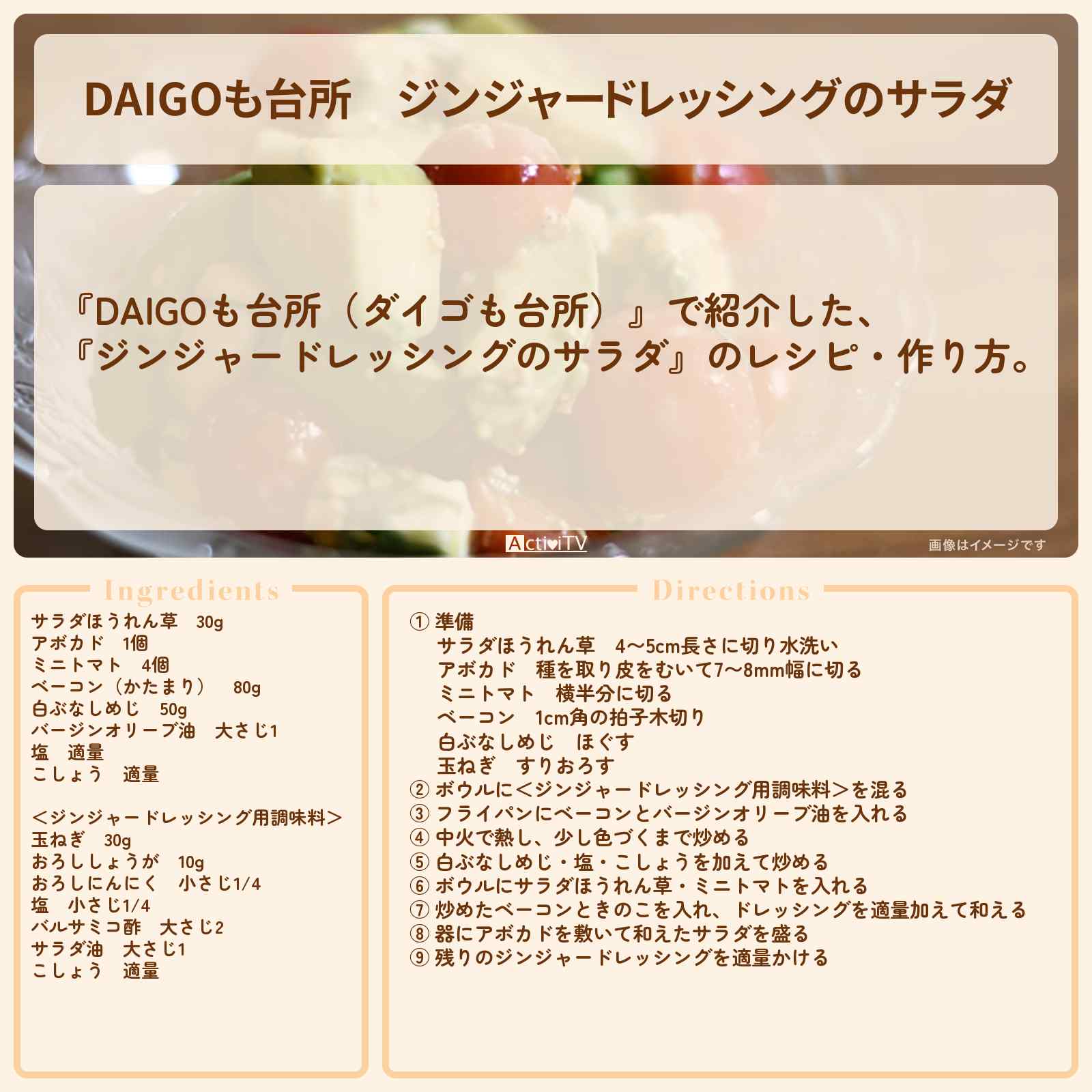 放送の【DAIGOも台所(ダイゴも台所)】で紹介した、『ジンジャードレッシングのサラダ』のレシピ・作り方。