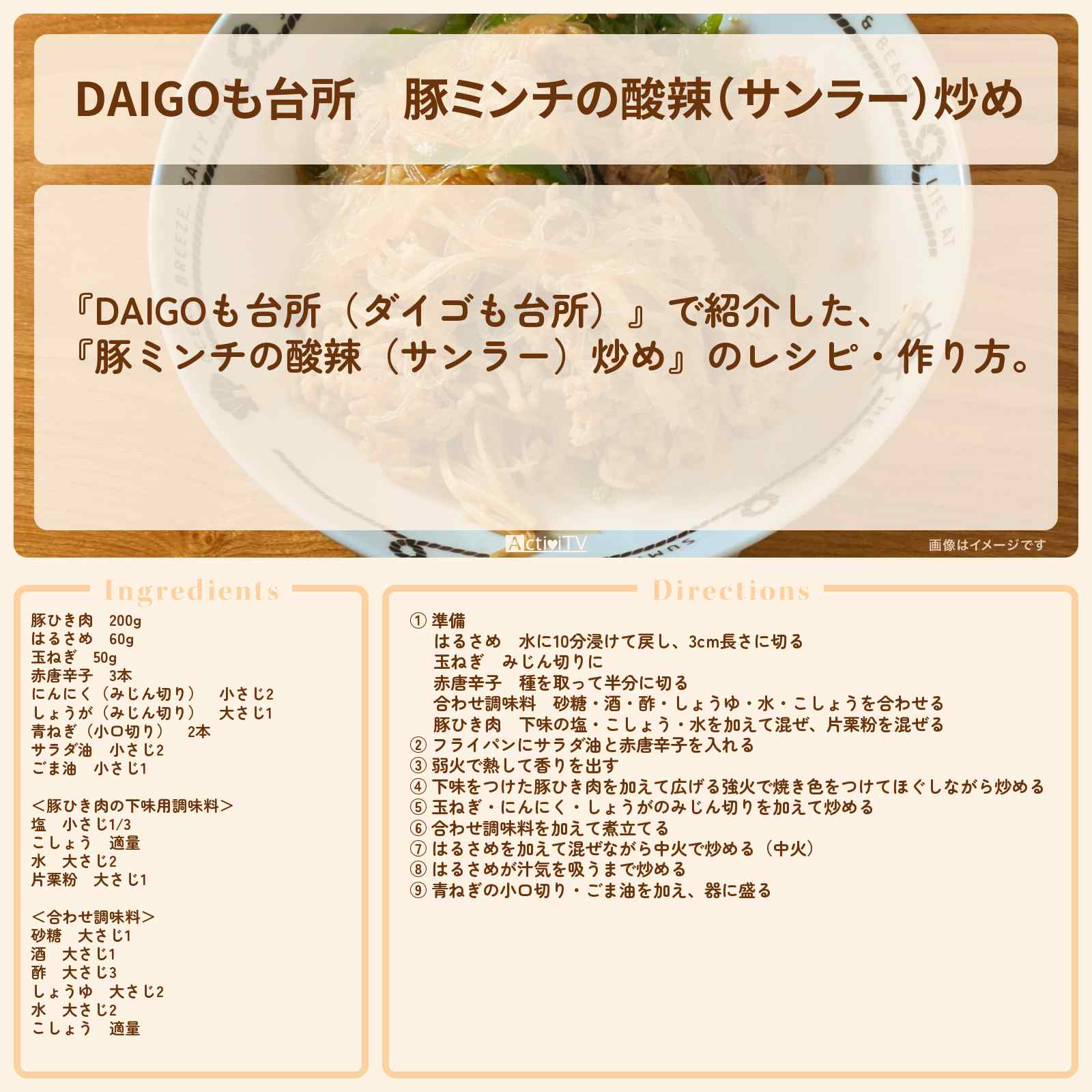 放送の【DAIGOも台所(ダイゴも台所)】で紹介した、『豚ミンチの酸辣(サンラー)炒め』のレシピ・作り方。