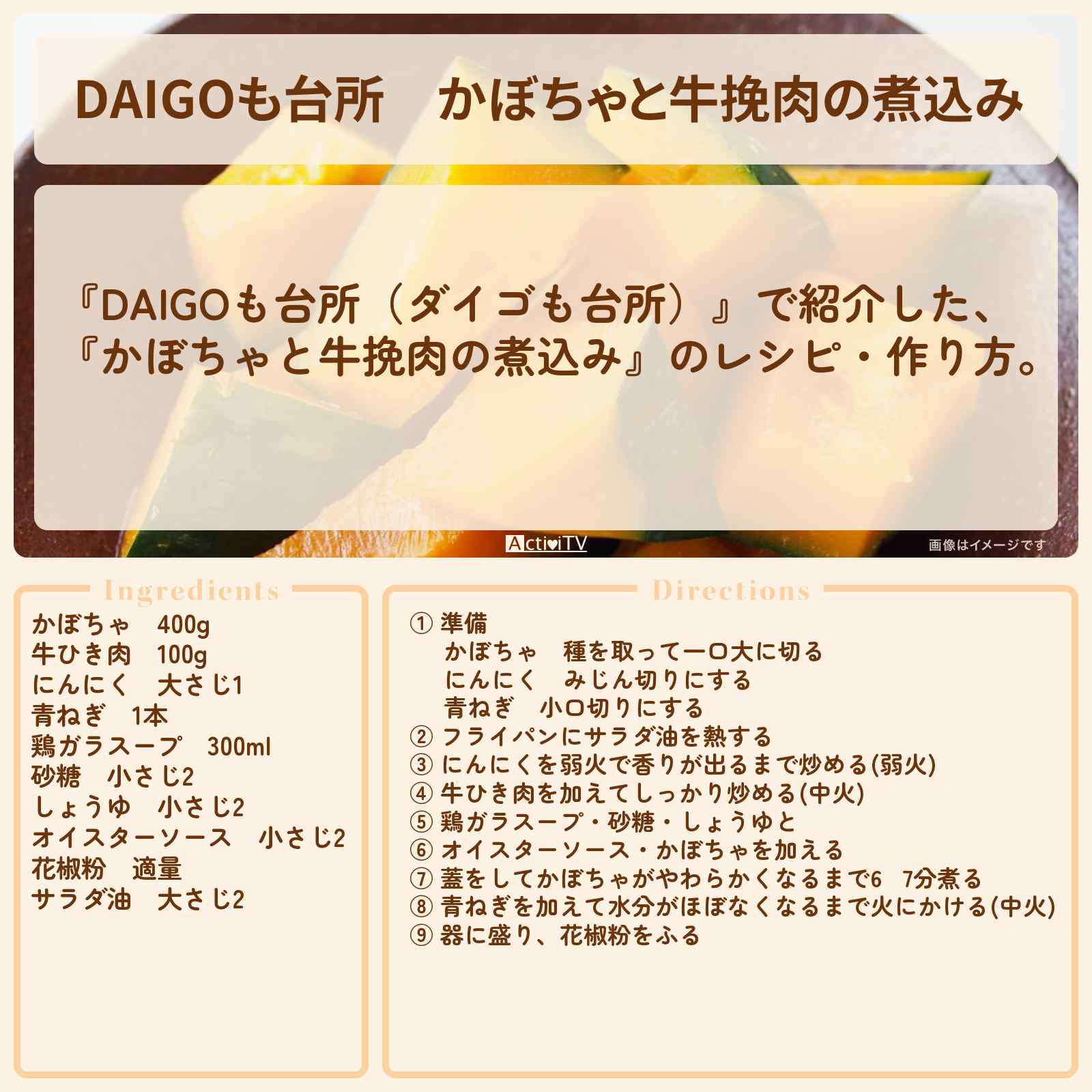 放送の【DAIGOも台所(ダイゴも台所)】で紹介した、『かぼちゃと牛挽肉の煮込み』のレシピ・作り方。