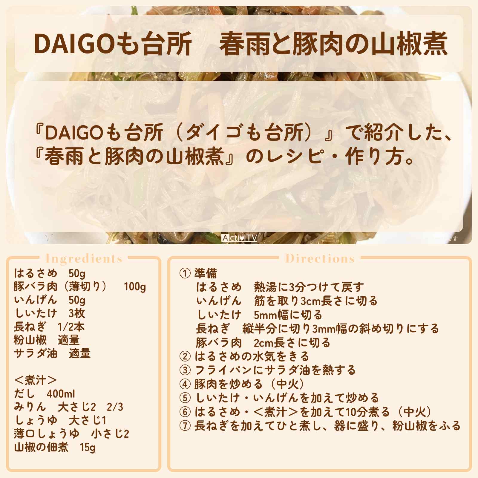 放送の【DAIGOも台所(ダイゴも台所)】で紹介した、『春雨と豚肉の山椒煮』のレシピ・作り方。
