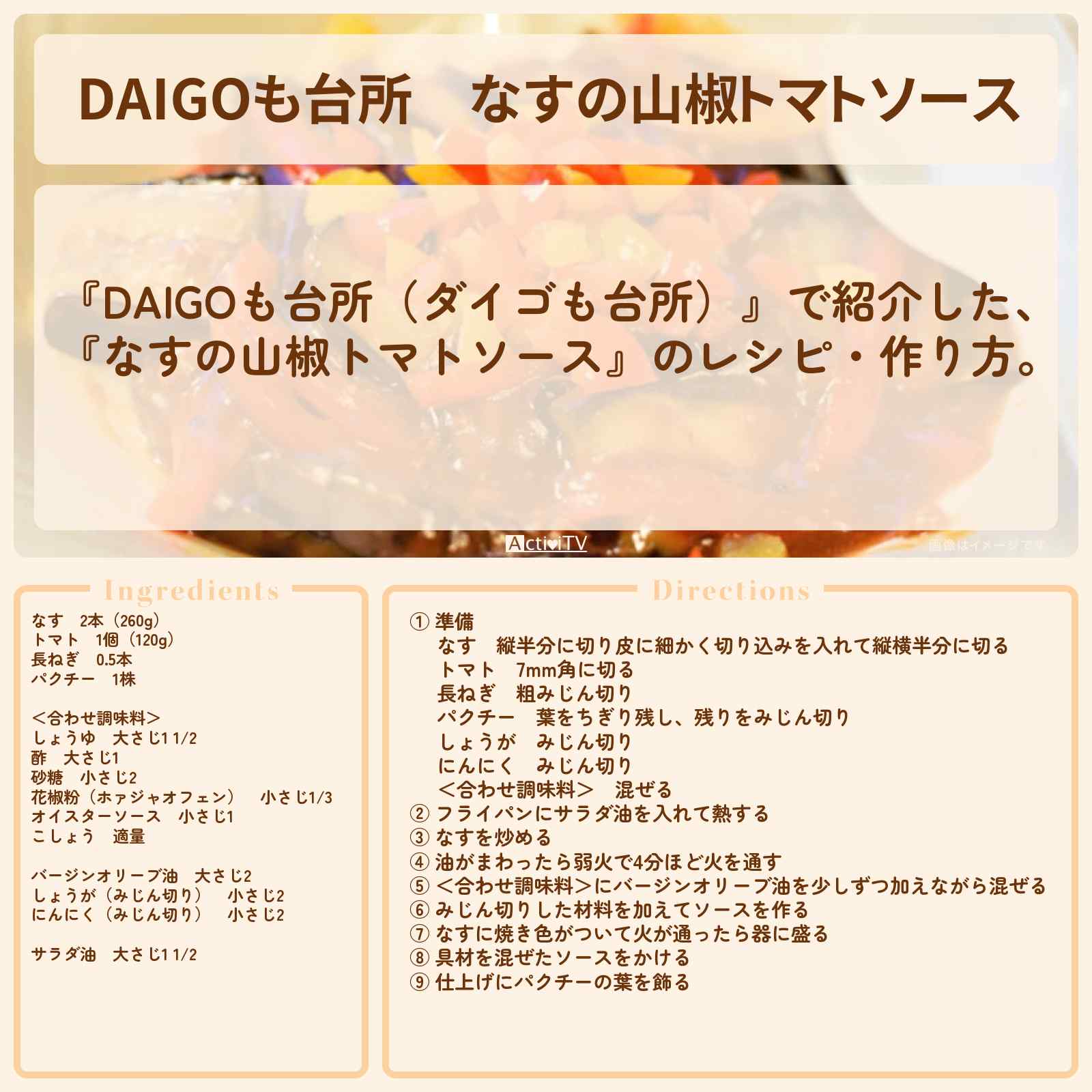 放送の【DAIGOも台所(ダイゴも台所)】で紹介した、『なすの山椒トマトソース』のレシピ・作り方。