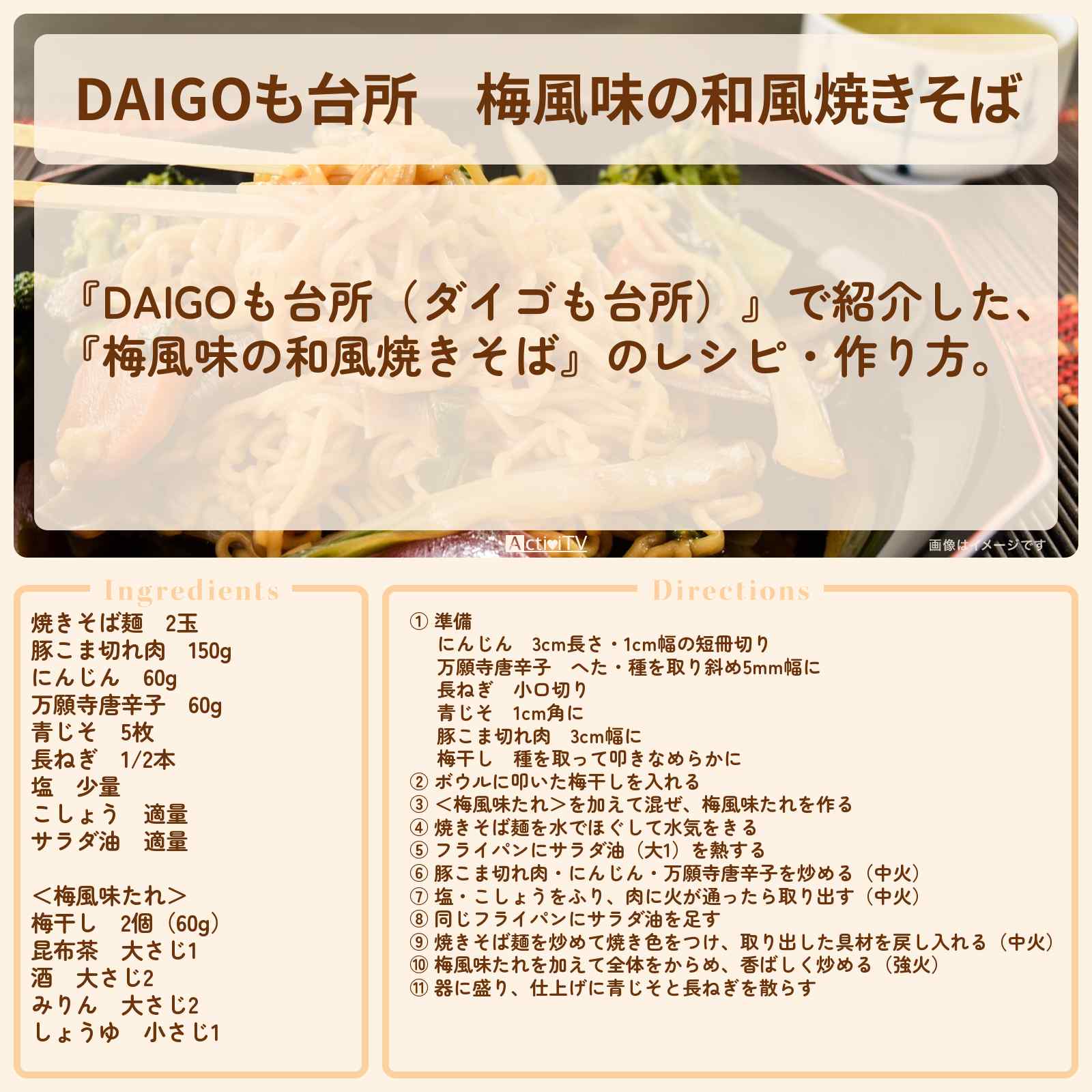 放送の【DAIGOも台所(ダイゴも台所)】で紹介した、『梅風味の和風焼きそば』のレシピ・作り方。