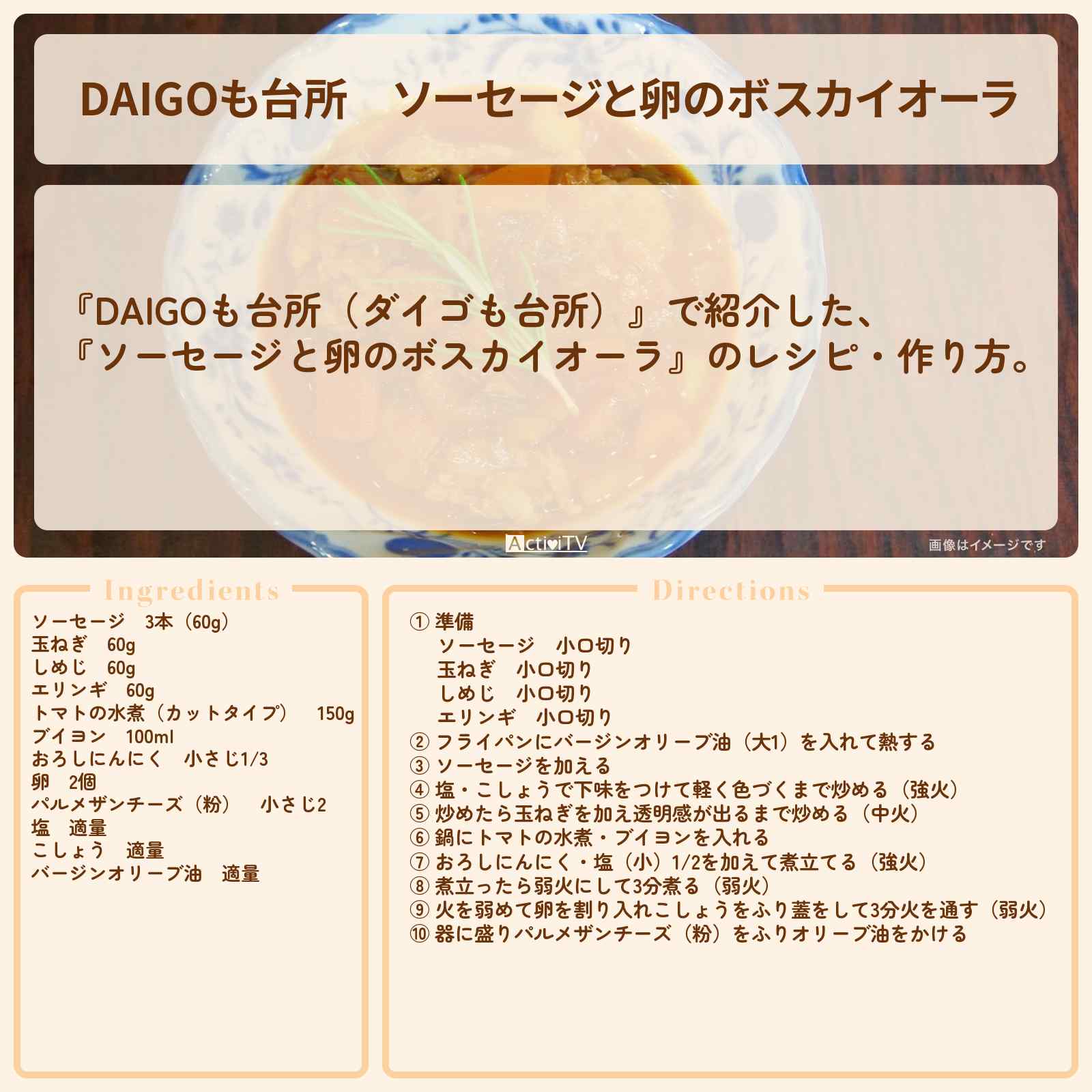放送の【DAIGOも台所(ダイゴも台所)】で紹介した、『ソーセージと卵のボスカイオーラ』のレシピ・作り方。