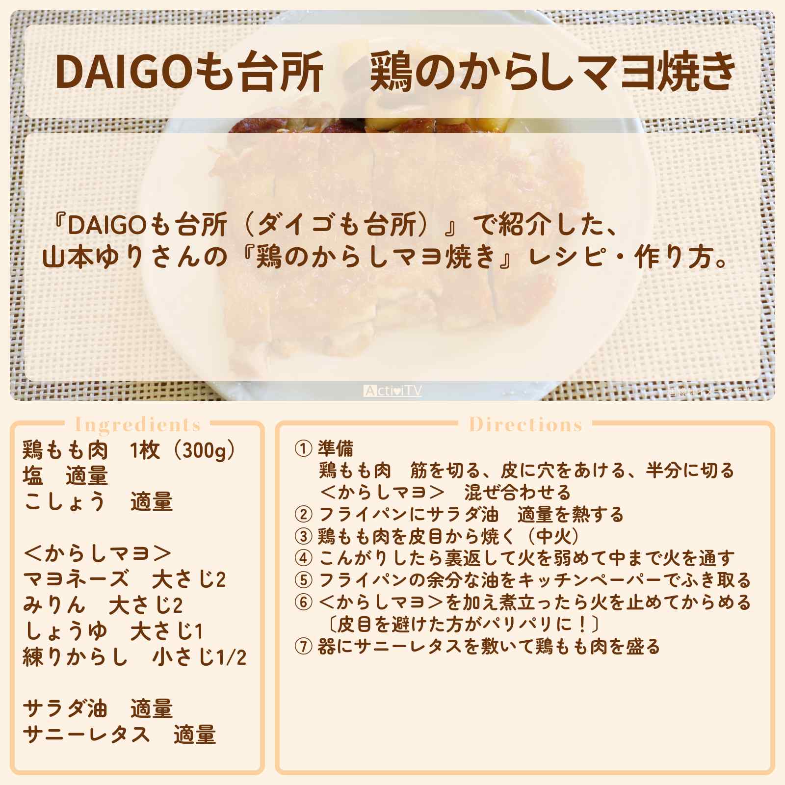 放送の【DAIGOも台所(ダイゴも台所)】で紹介した、山本ゆりさんの『鶏のからしマヨ焼き』レシピ・作り方。
