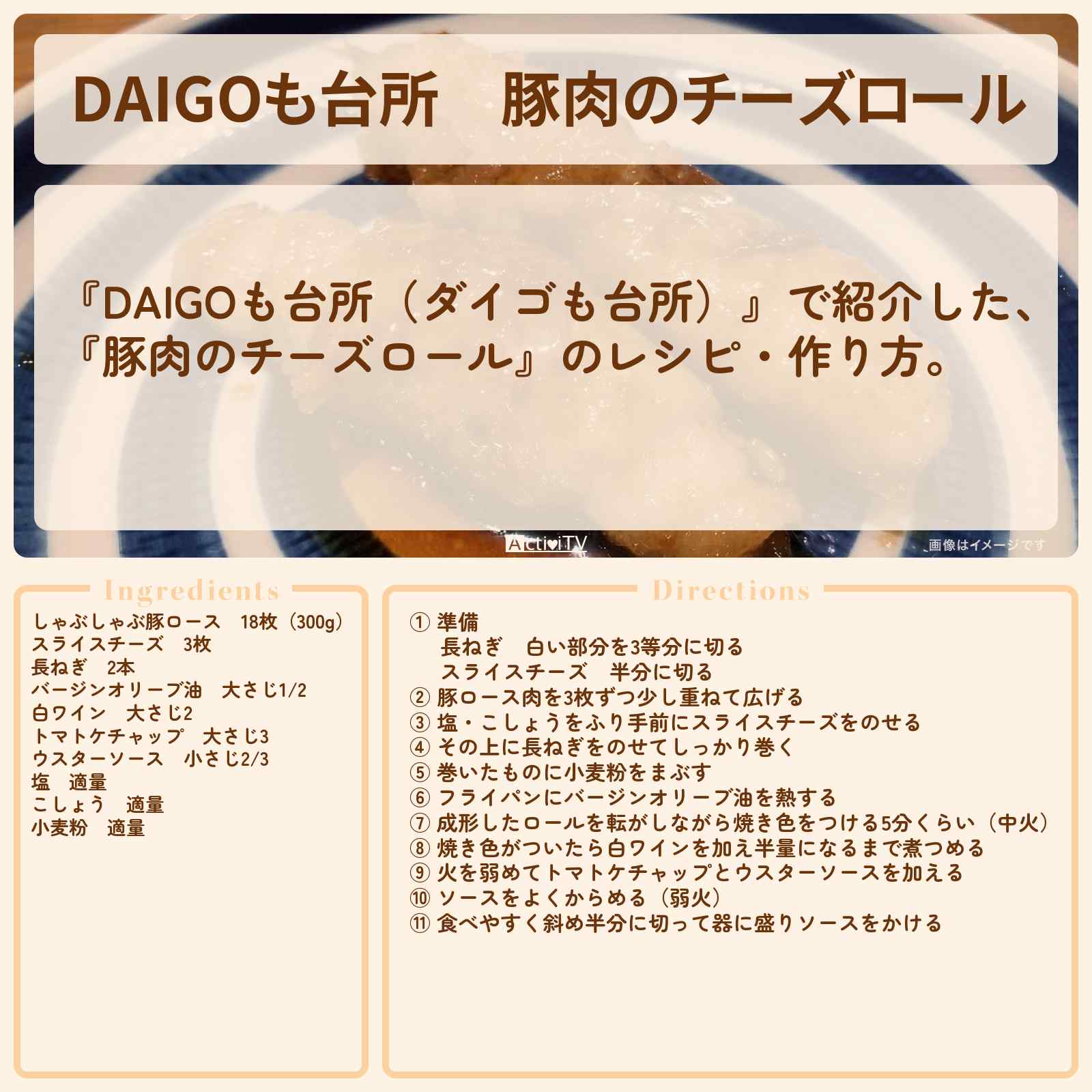放送の【DAIGOも台所(ダイゴも台所)】で紹介した、『豚肉のチーズロール』のレシピ・作り方。