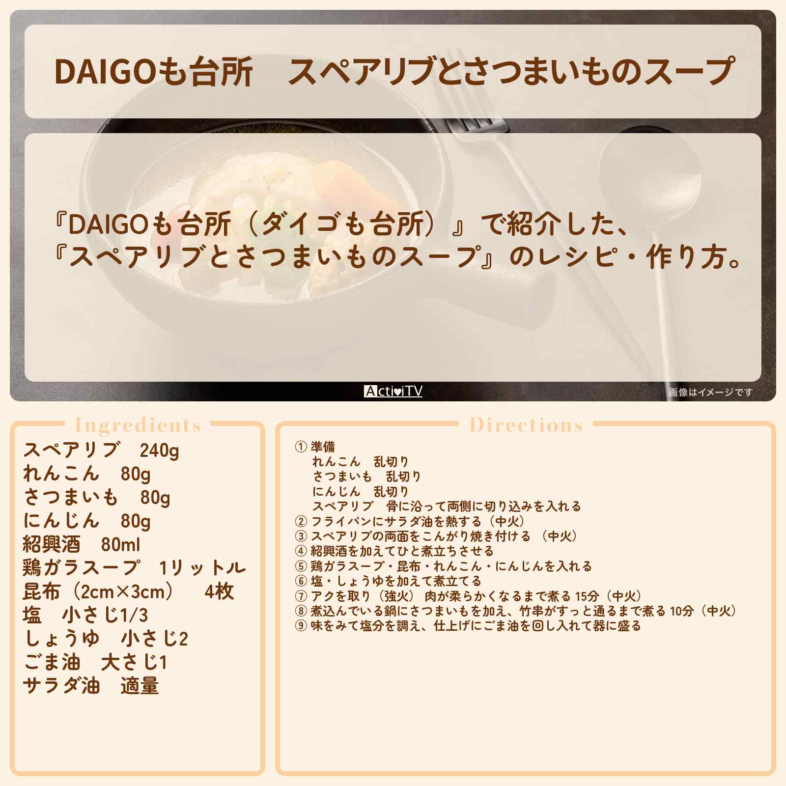 放送の【DAIGOも台所(ダイゴも台所)】で紹介した、『スペアリブとさつまいものスープ』のレシピ・作り方。