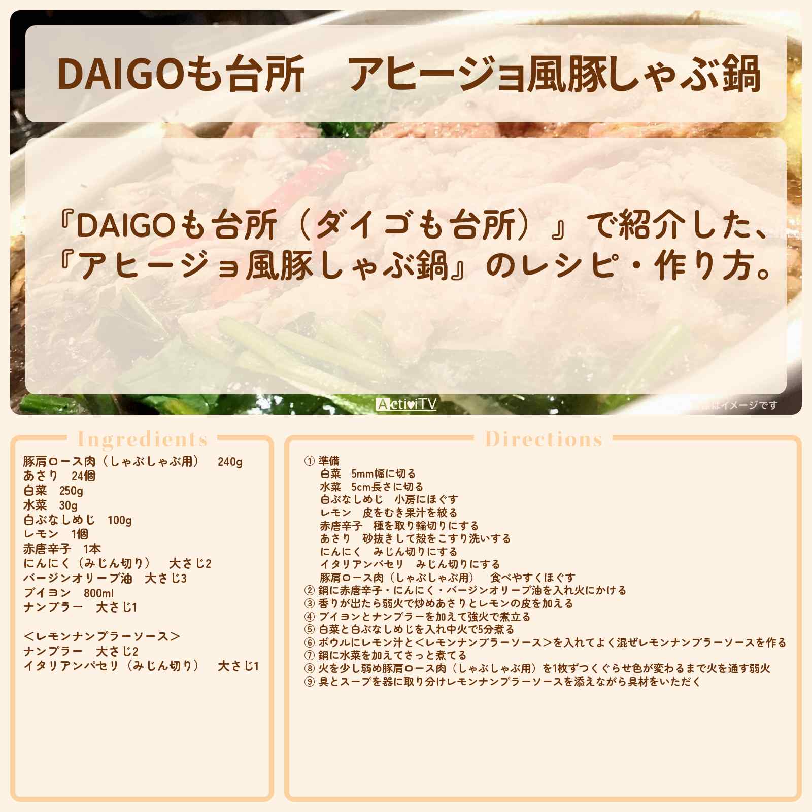 放送の【DAIGOも台所(ダイゴも台所)】で紹介した、『アヒージョ風豚しゃぶ鍋』のレシピ・作り方。